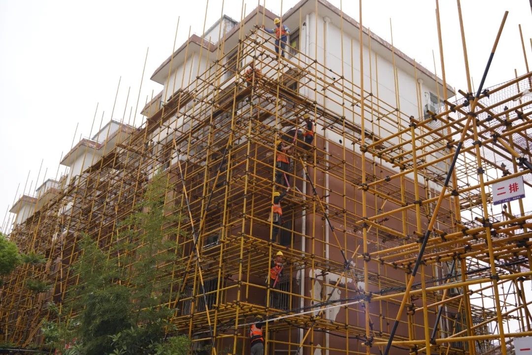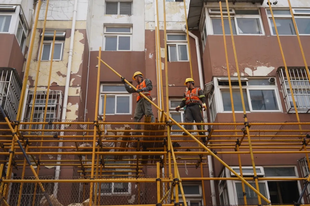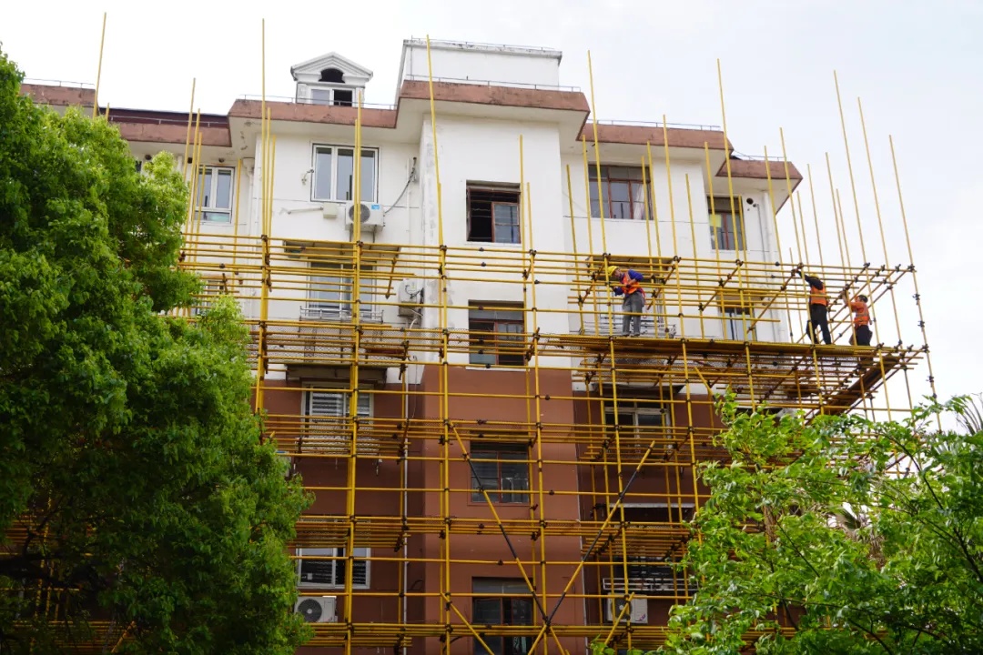 记者在金华新村看到,实施改造的楼栋外,已经搭起了脚手架,立起了安全警示牌,工人们正在有序作业。为进一步降低施工对居民生活造成的影响,工程采取分批分栋滚动实施。