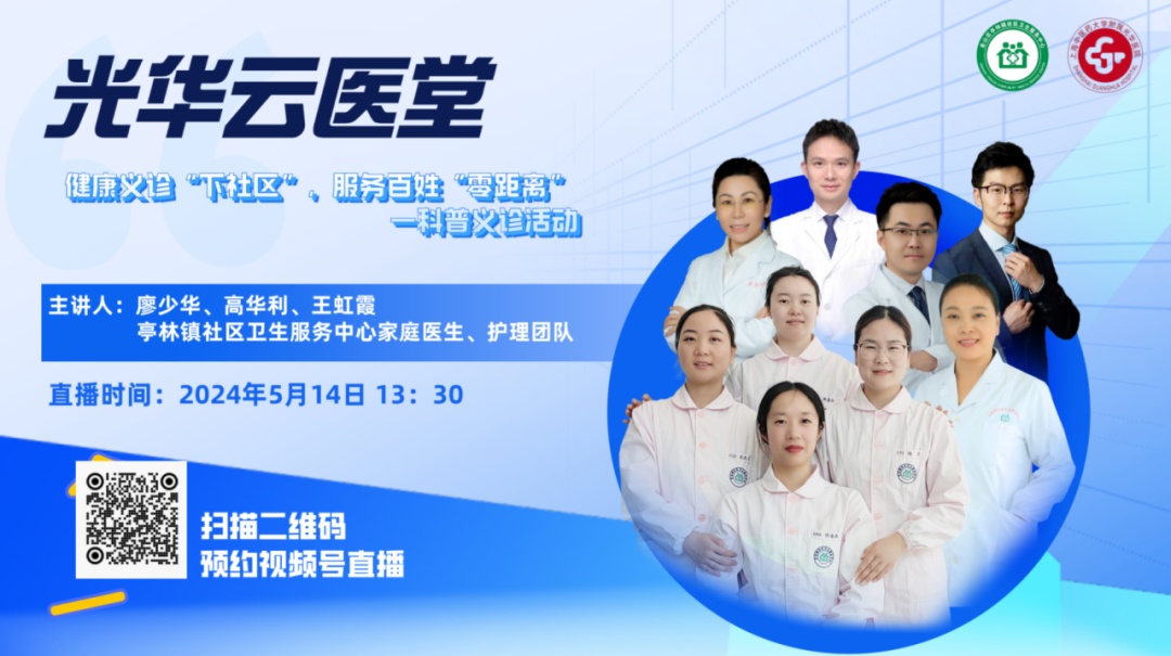 直播时间 5月14日 13:30—15:30 直播主题 健康义诊“下社区” 服务百姓“零距离” 直播专家 王虹霞 光华医院眼科副主任医师,擅长风湿病相关眼病治疗、复杂青光眼、白内障手术。 高华利 光华医院关节矫形外科副主任医师,擅长肩、肘关节修复、置换。 廖少华 光华医院神经内科主任医师,擅长脑卒中介入、神经、前庭相关疾病治疗。 扫描下方二维码 下载“上海长宁”APP 便可从首页进入直播间