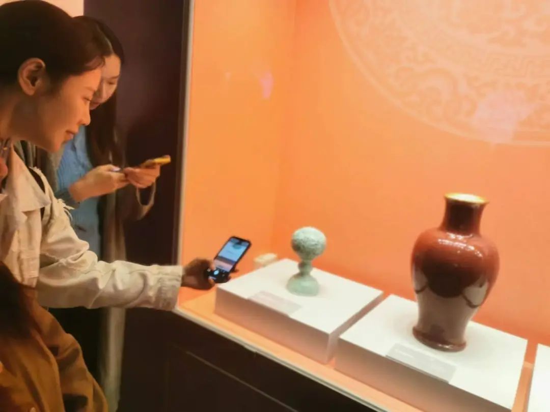 图为观众正在欣赏展出的乾隆款松石绿釉镂空冠架 胡思华 摄