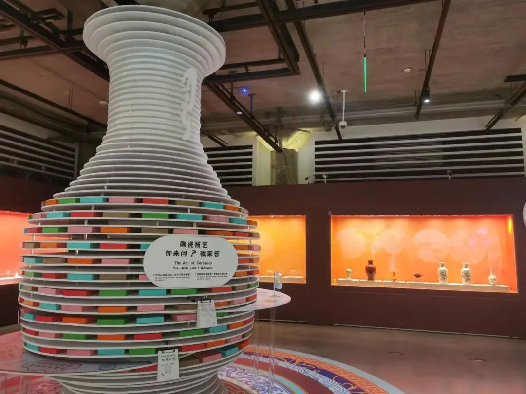 以标志着中国古代制瓷工艺顶峰的釉彩大瓶——“瓷母”为蓝本制作的艺术装置伫立在该展区中央。跟随展区参观动线,观众可以深入了解陶瓷制作工艺的关键工序。同时,为了让观众沉浸式体验“陶瓷之技”,展览现场不仅陈列了陶瓷制作原料、工具、制作过程半成品,还通过“陶艺DIY”等互动展项,带领观众快速体验陶艺制作过程。