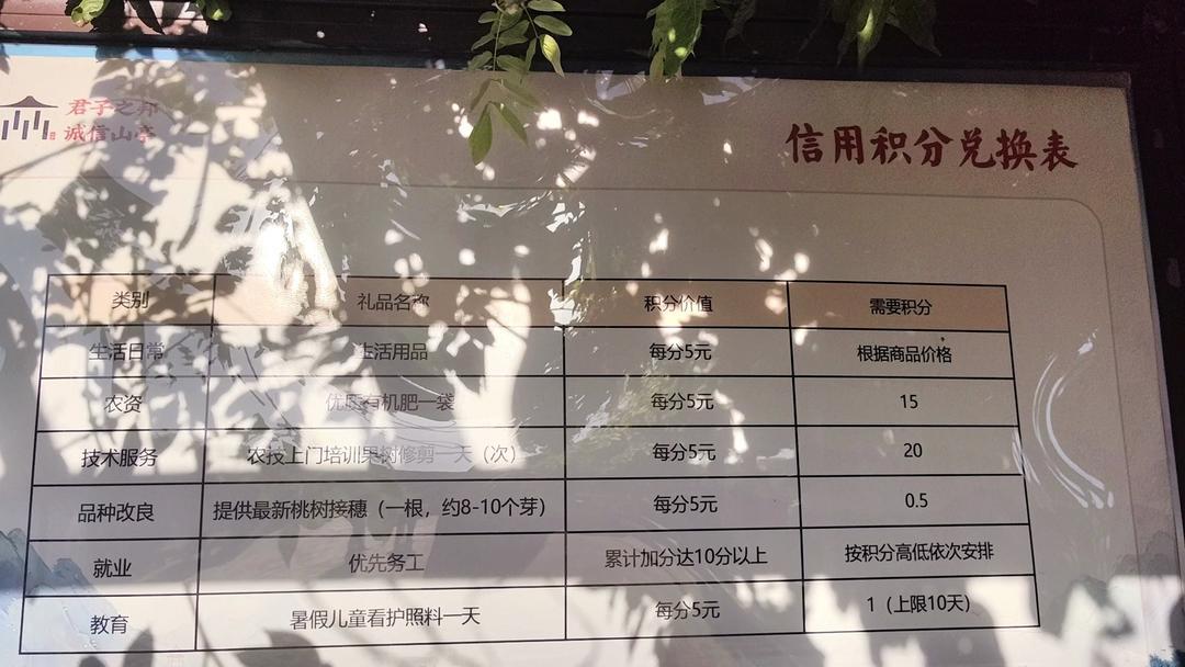 5月15日下午5点,记者来到了枣庄市山亭区冯卯镇温庄村。在温庄村社区服务中心前,有一处信用主题文化广场。各种耳熟能详的诚信故事、温庄村信用积分兑换表等信用体系建设内容张贴在广场内的告示板上。