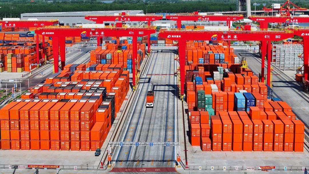 无人卡车载着集装箱来回穿梭在泊位和堆场之间。