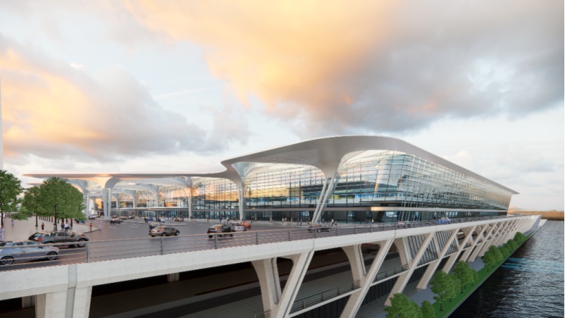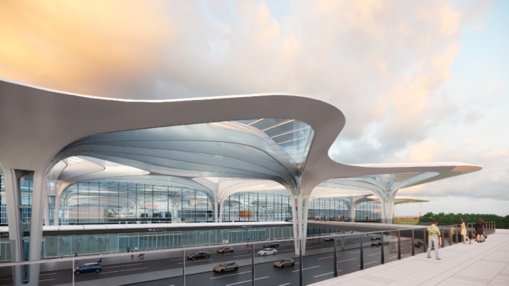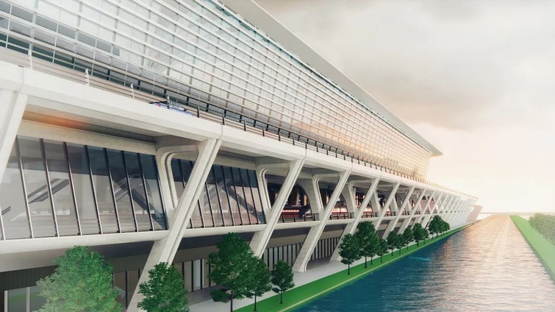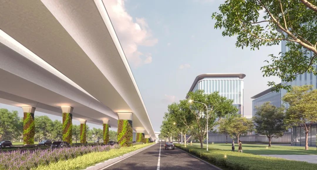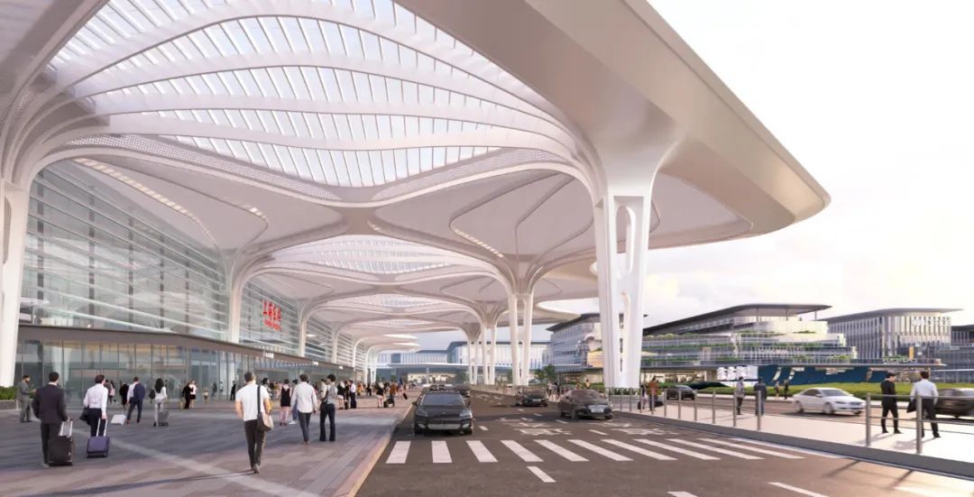 集疏运道路风貌提升方案以“集浪弄潮,运通未来”为设计理念。以站、场、城融合为目标,将建筑、市政、景观融为一体,打造绿色生态枢纽,提升东方枢纽城市门户形象。