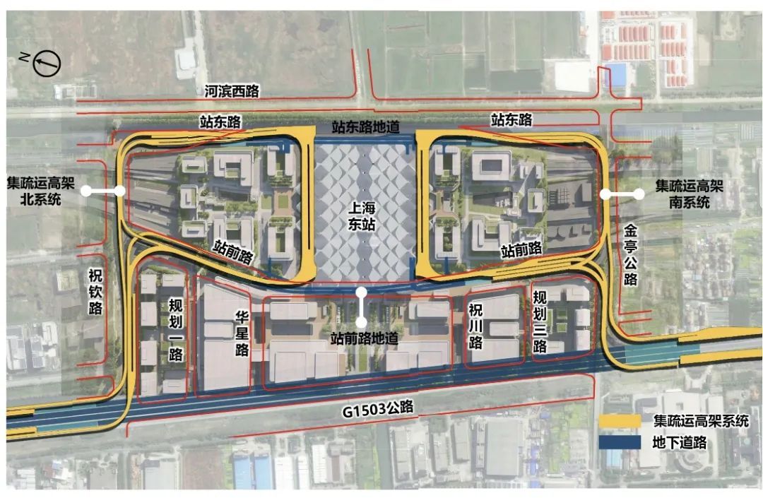 面对交通需求南北不均的矛盾和站城一体融合发展的需求,上海东站集疏运工程是上海市范围内第一个构建了交通枢纽多层次互通快速交通体系的道路工程项目。其中,在东站外围,利用S3-S32公路和南六快速路-S32公路对周邓快速路进行分流;在东站内部,利用站前路、站东路地道与集疏运匝道系统构建了南北快速联系的动态调节路网体系,实现快进快出、南北均衡、远近分离、动态调剂的灵活可靠的交通组织。