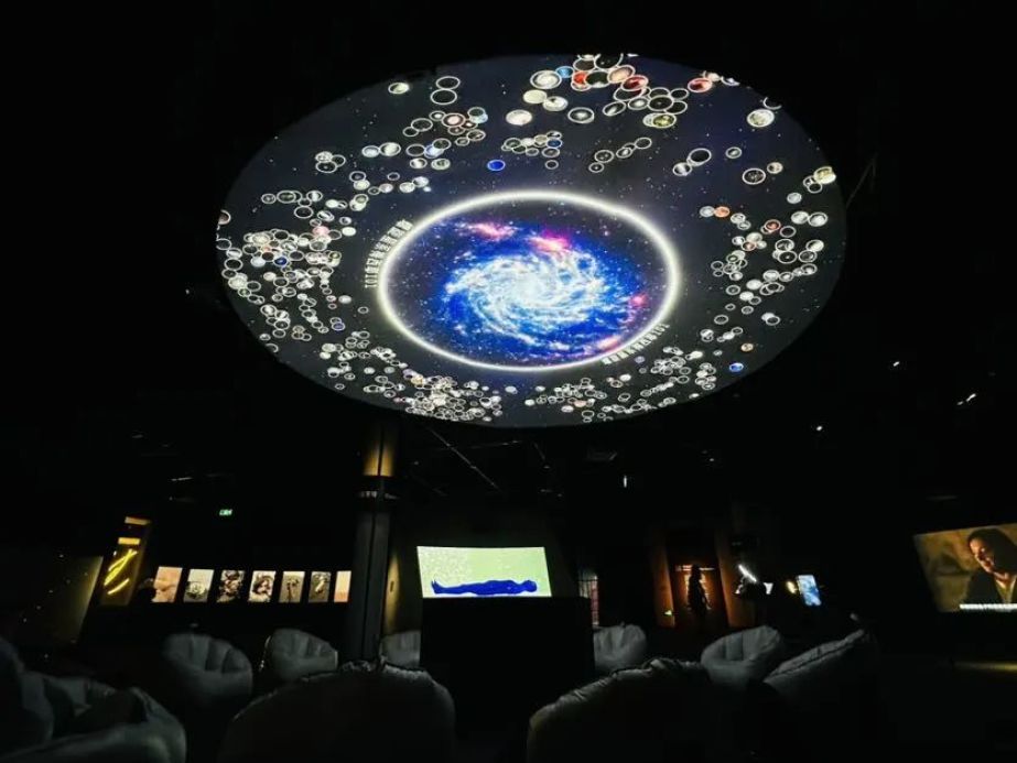 “400光年外的恒星”“老鹰星云”……这些遥远的星空宇宙在“心底苍穹”板块实现了近距离“接触”。“观众可以放松躺下仰望《宇宙碰撞》作品,在大屏里可以看到世界各地望远镜拍摄到的星空影像等。”展览策展人龙星如介绍道,观众更可以用移动设备自主选择穹顶上的微型“气泡”,将一个气泡从外围拖到中心,“爆炸”成大幅图像,在玩耍中欣赏哈勃和韦布空间望远镜的精彩影像,领略宇宙之美。