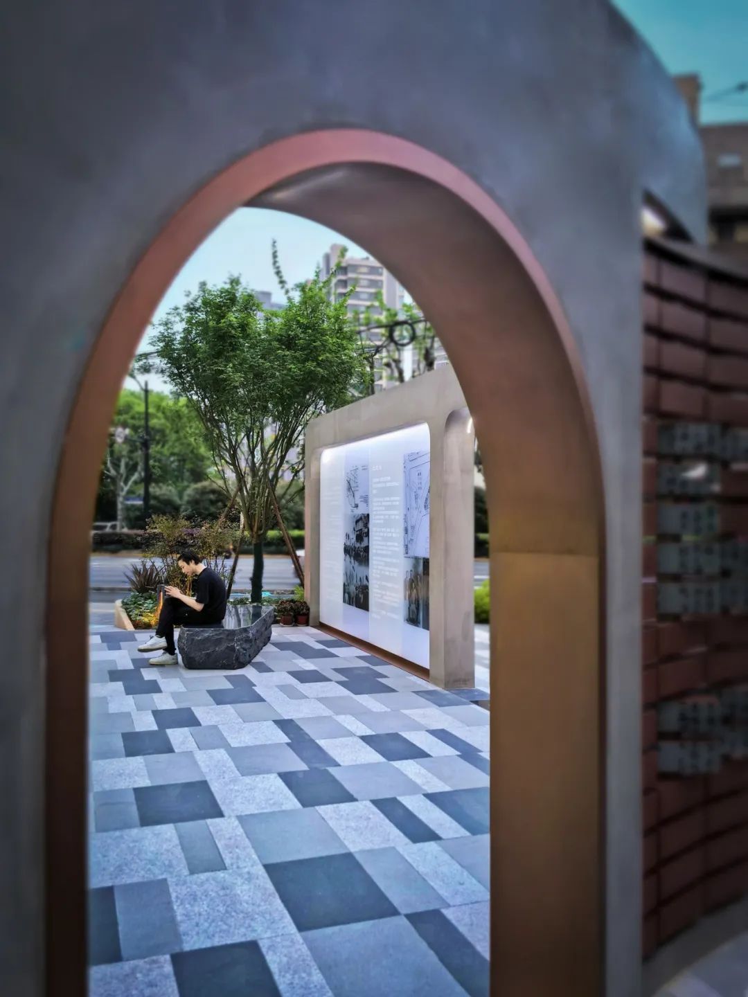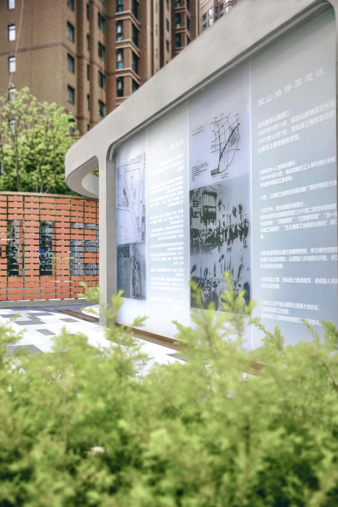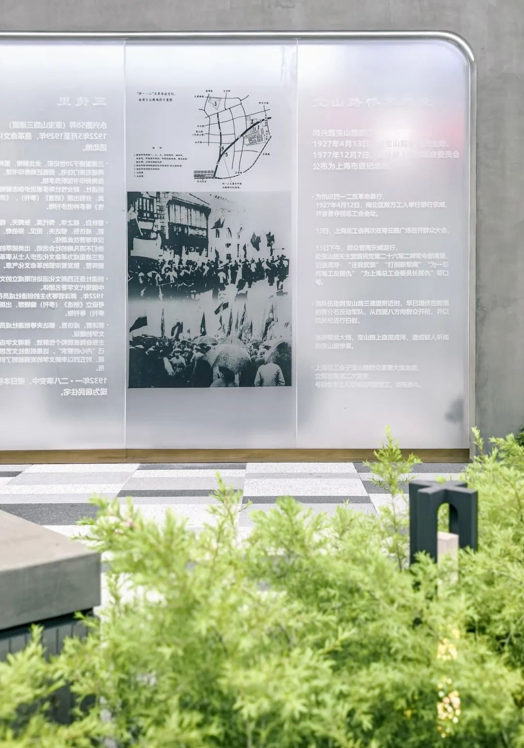 宝山路、鸿兴路的街角焕新就是“红色宝山路”街区更新项目之一,这里是“四一二”惨案革命群众流血牺牲地遗址。“上海市文物保护单位”的纪念碑庄严矗立,体现了场所的历史底色。街角中央是纪念性景墙,通过黑白图片和雕刻文字交织的形式叙述着宝山路“四一二”历史事件。