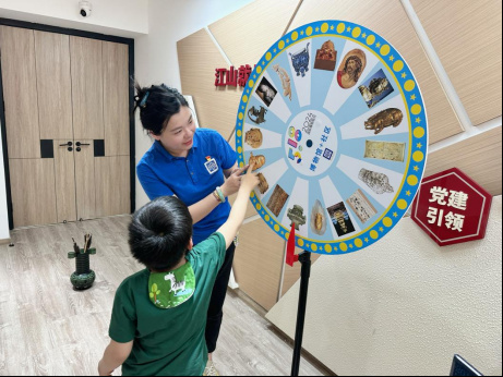 为了呼应今年国际博物馆日“博物馆致力于教育和研究”的主题,南京博物院还积极走进社区,开展精彩的社教活动。在南京市雨花台区西善桥街道明义社区,南京博物院社教专员李蔚瑶为社区居民送去了一场生动的博物馆教育活动。互动式的游戏吸引着小朋友对博物馆产生浓厚兴趣,通过文博知识趣味问答,让小朋友和家长了解了南博的镇院之宝,使文化教育更加贴近儿童、贴近家庭。