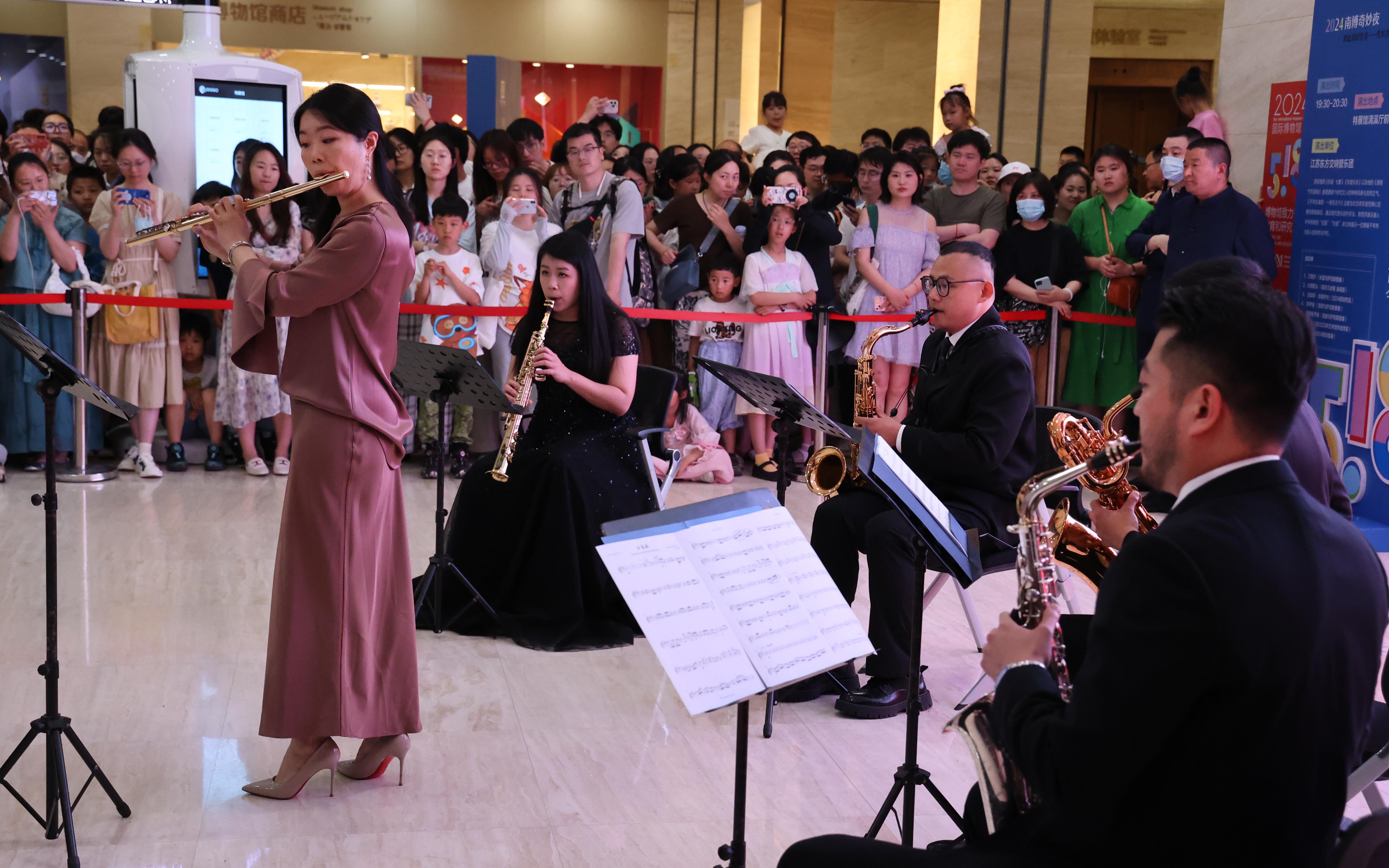 今年的南博奇妙夜,苏轼的元素在艺术馆、特展馆等处都可以找到。在艺术馆一楼中厅,江苏交通广播网主持人和“小小南博蓝”志愿者共同朗诵苏轼的诗词《水调歌头》《念奴娇·赤壁怀古》;在特展馆清溪厅前,江苏东方交响管乐团带来一场“千年东坡韵·一辞乐古今”的表演,通过现代音乐创作手法,将西洋器乐融入中华传统“古韵”“古音”,来展示苏轼的传奇与不朽;两位装扮成苏轼不同年龄段的演员,出现在特展馆中,吸引来观众与他们合影。
