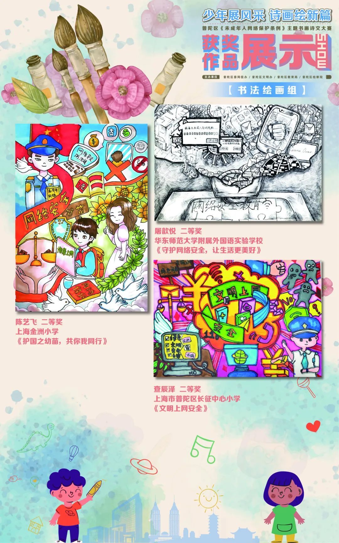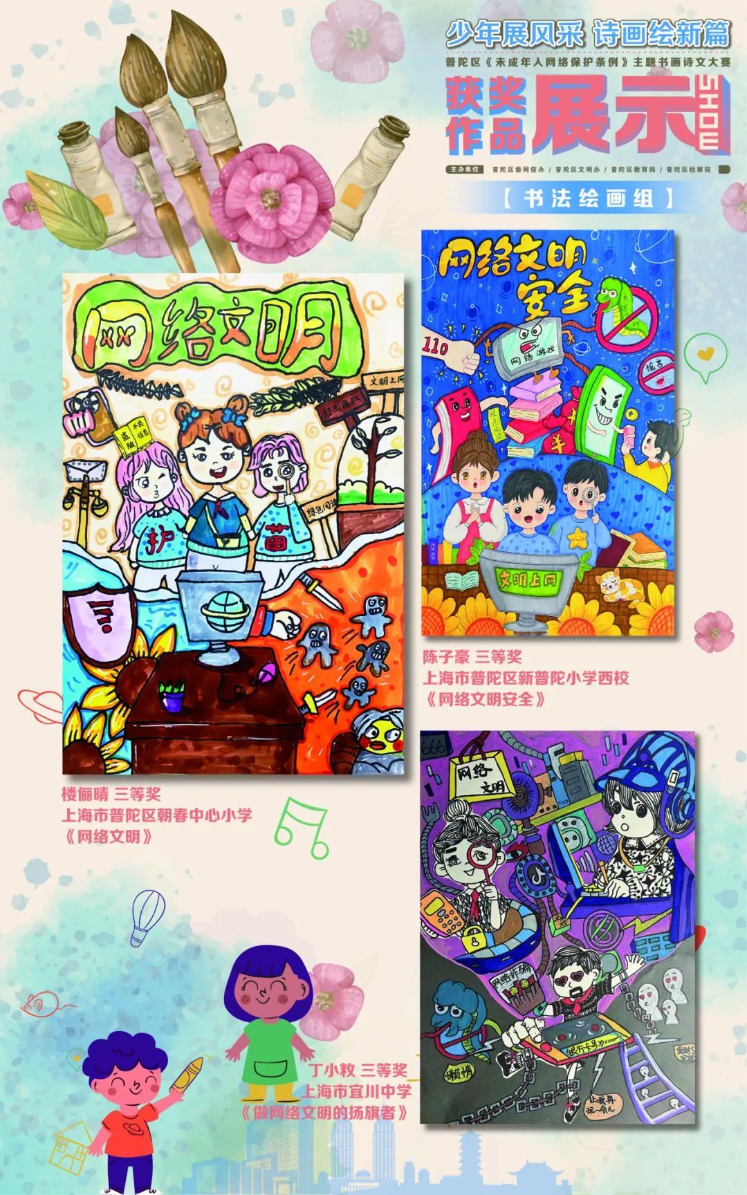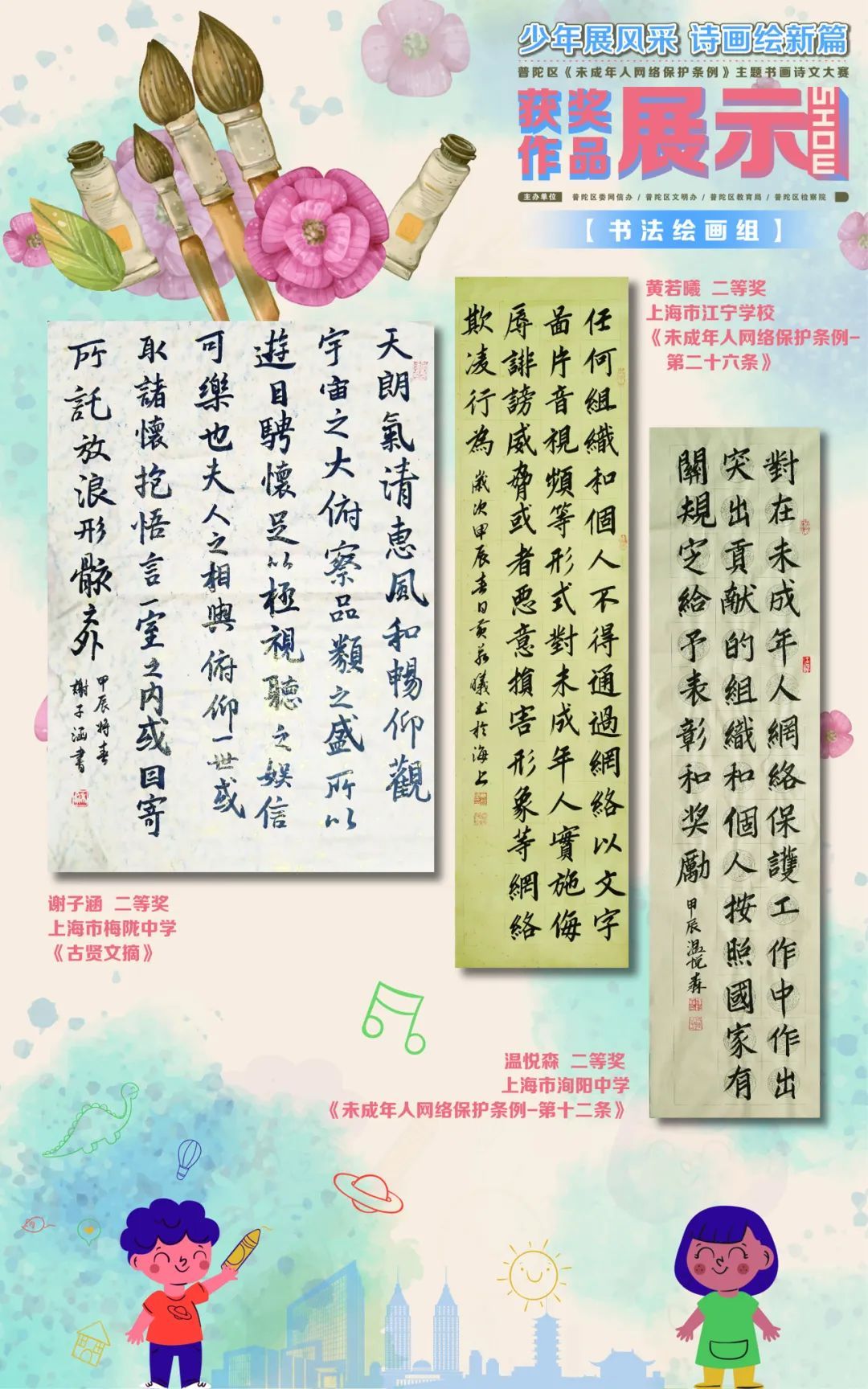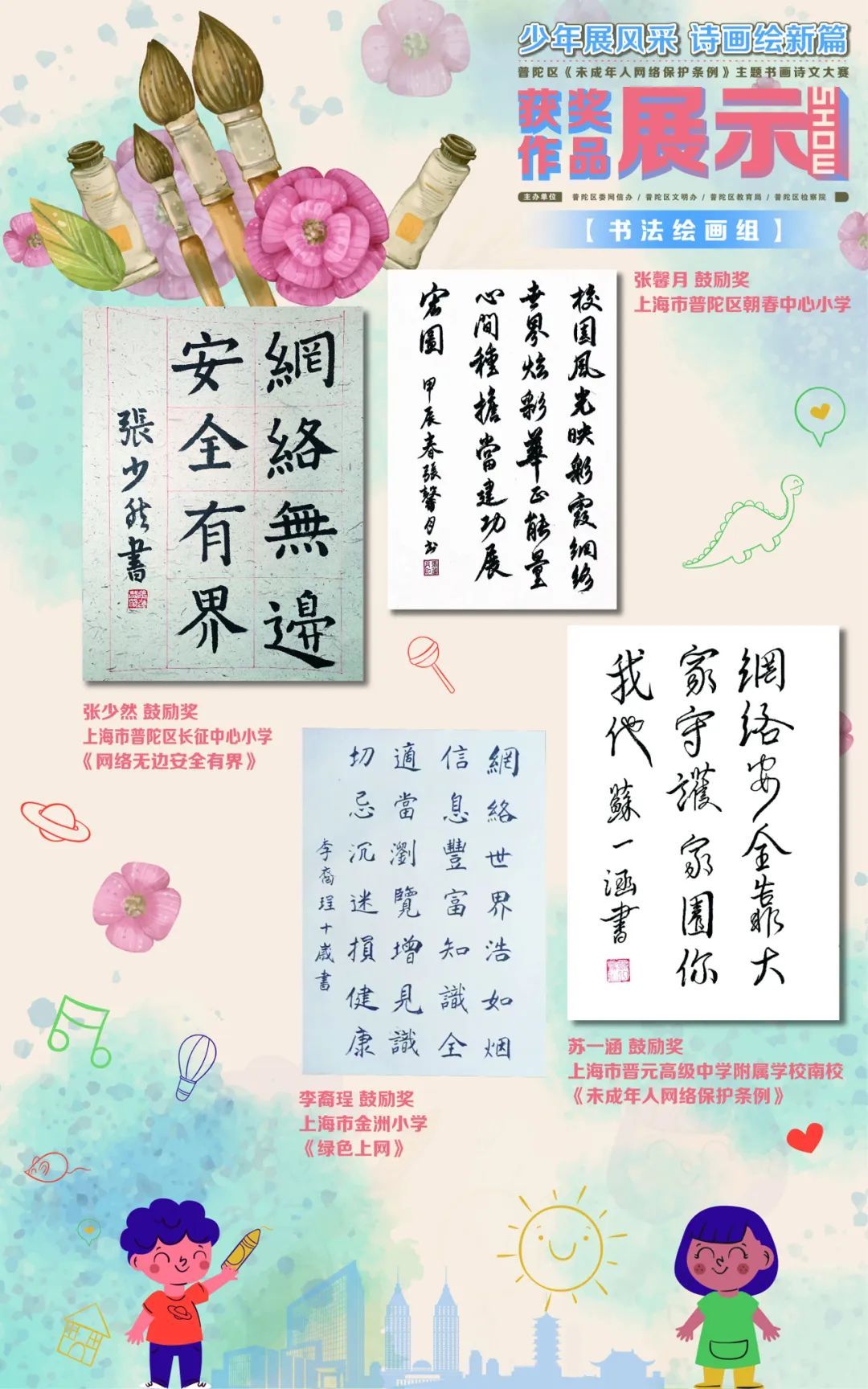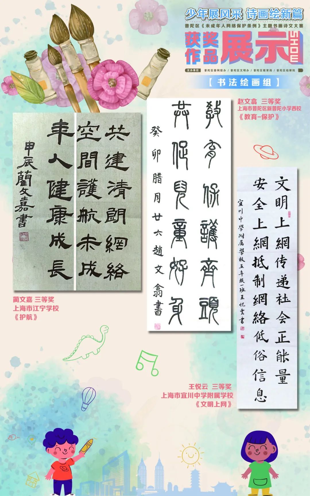 根据2024年1月1日正式施行的《未成年人网络保护条例》,为切实提高未成年人网络安全意识,营造有利于未成年人身心健康成长的网络环境,普陀区委网信办、普陀区文明办、普陀区教育局、普陀区检察院联合举办了“少年展风采 诗画绘新篇”普陀区《未成年人网络保护条例》主题书画诗文大赛,接下来让我们一起去看看那些获奖的优秀作品吧!