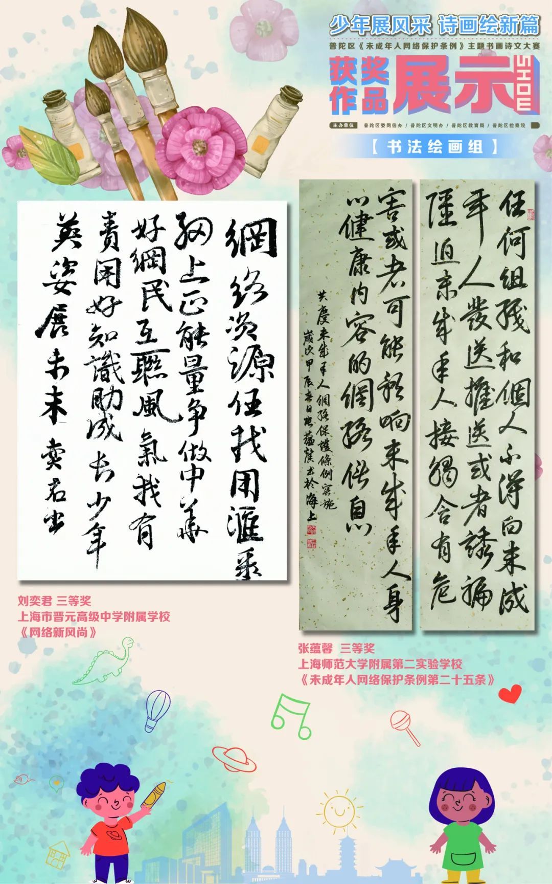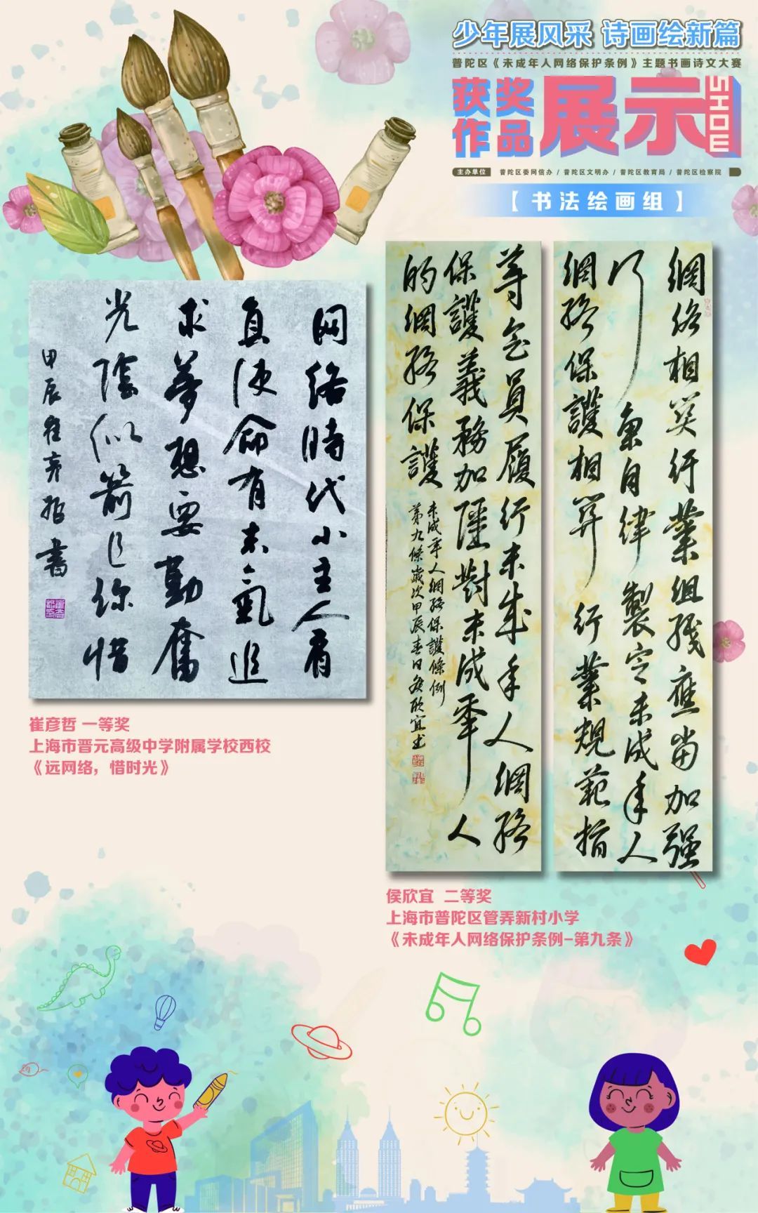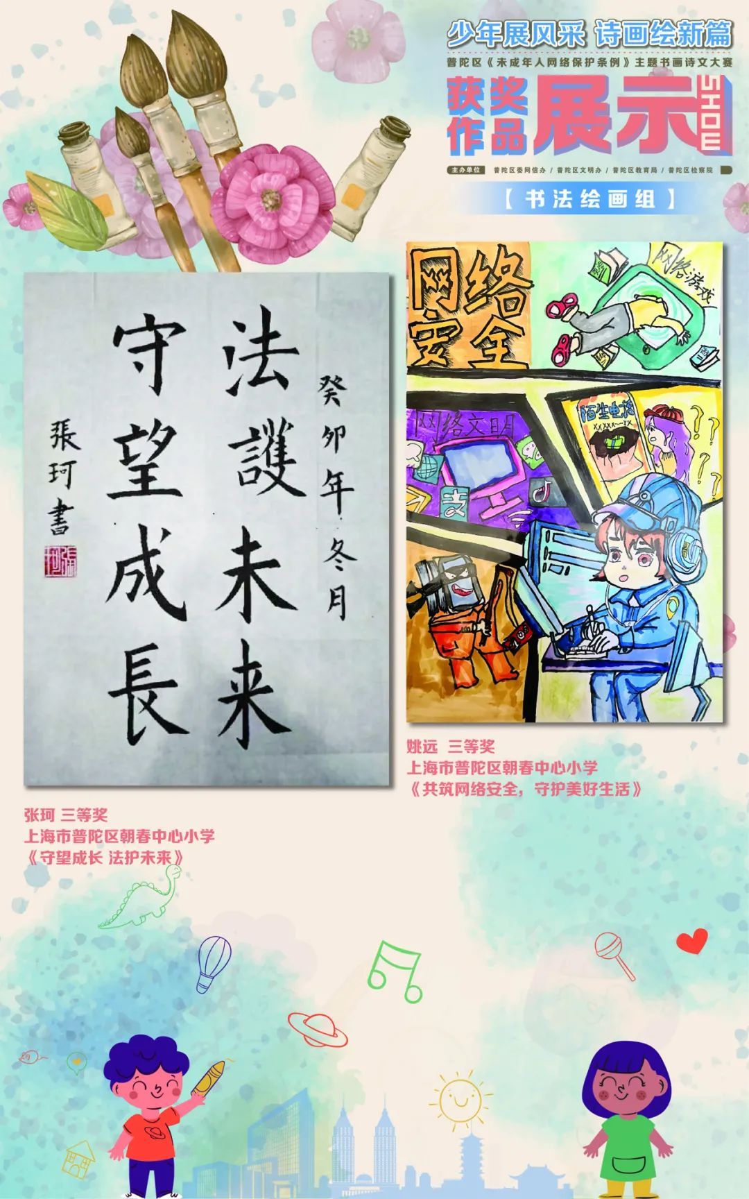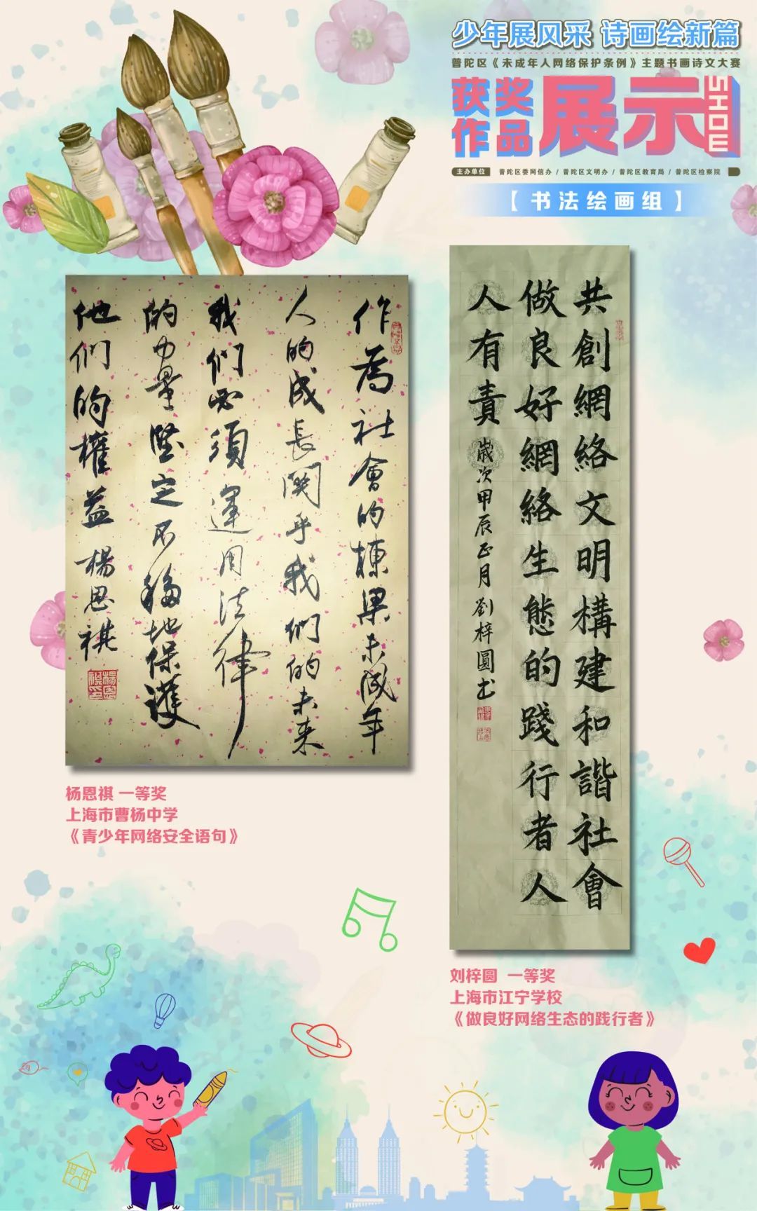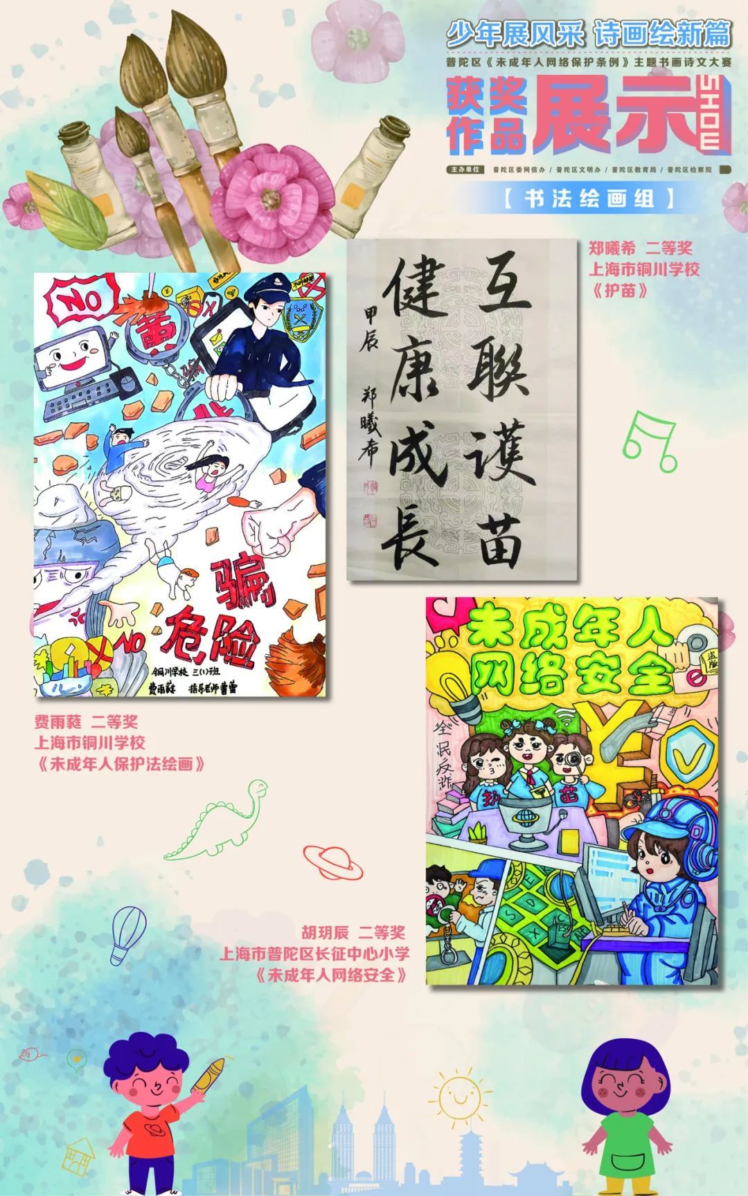 根据2024年1月1日正式施行的《未成年人网络保护条例》,为切实提高未成年人网络安全意识,营造有利于未成年人身心健康成长的网络环境,普陀区委网信办、普陀区文明办、普陀区教育局、普陀区检察院联合举办了“少年展风采 诗画绘新篇”普陀区《未成年人网络保护条例》主题书画诗文大赛,接下来让我们一起去看看那些获奖的优秀作品吧!