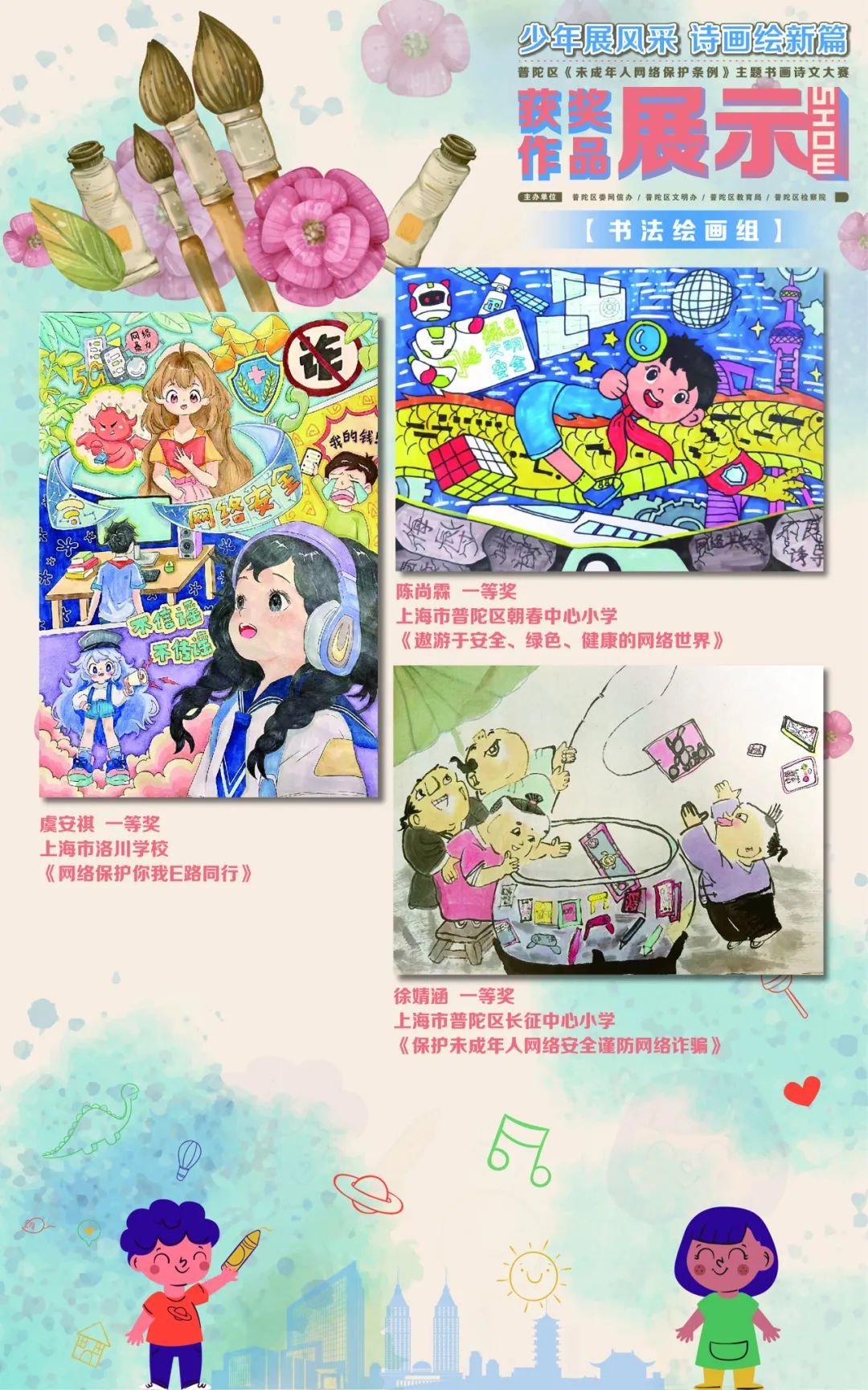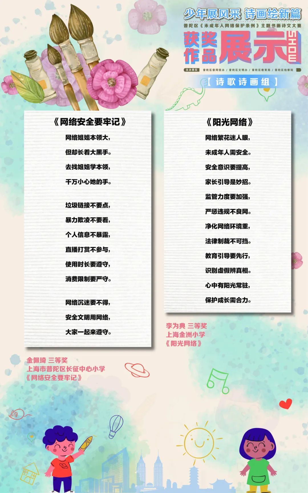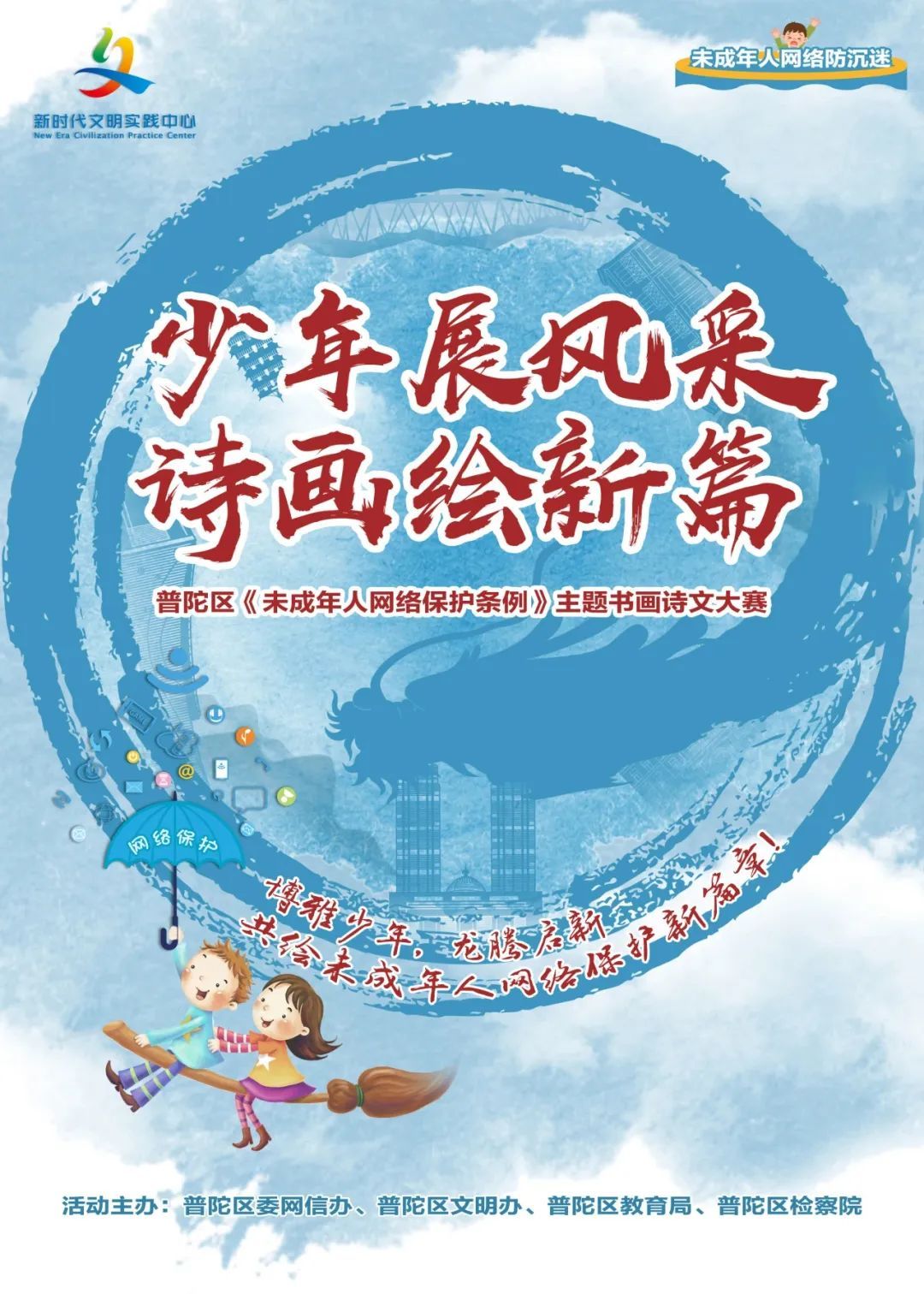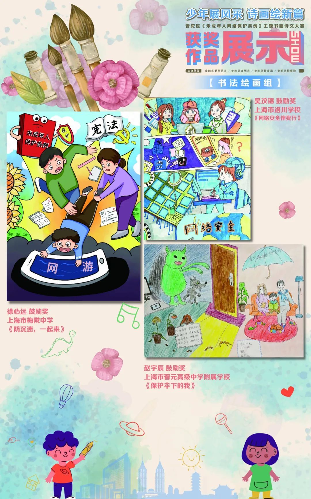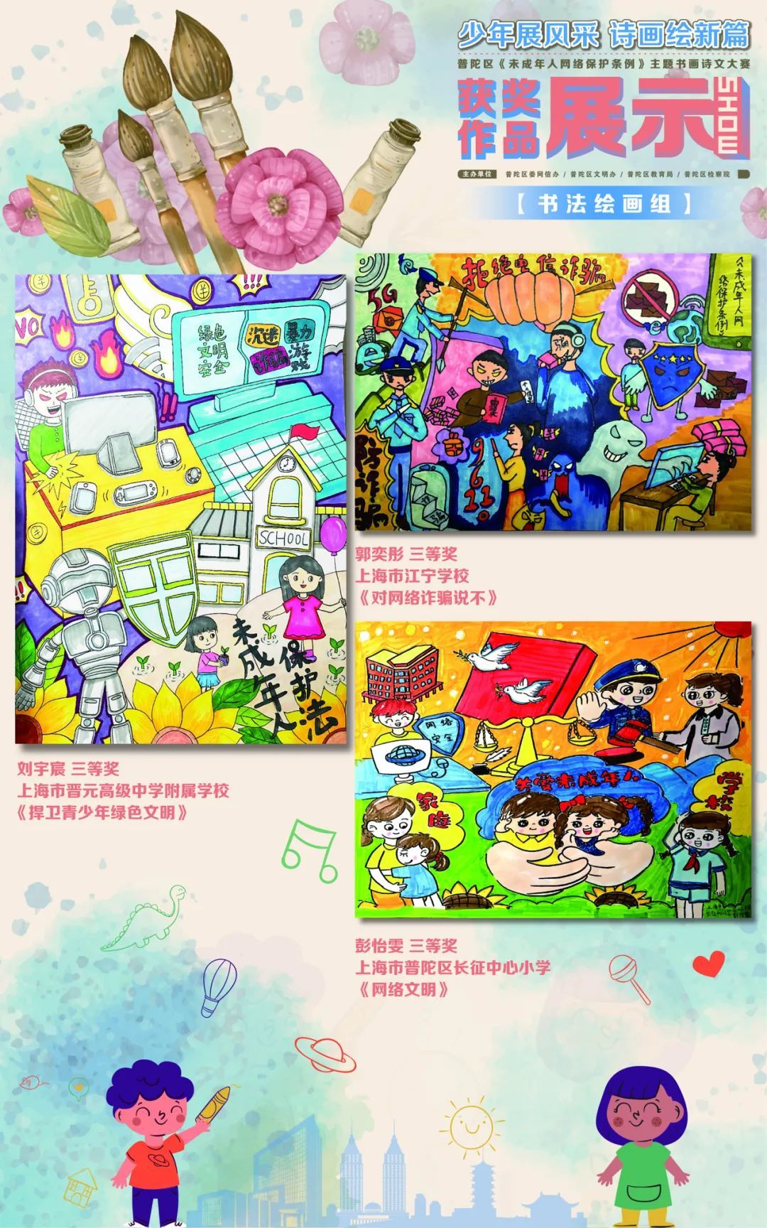 根据2024年1月1日正式施行的《未成年人网络保护条例》,为切实提高未成年人网络安全意识,营造有利于未成年人身心健康成长的网络环境,普陀区委网信办、普陀区文明办、普陀区教育局、普陀区检察院联合举办了“少年展风采 诗画绘新篇”普陀区《未成年人网络保护条例》主题书画诗文大赛,接下来让我们一起去看看那些获奖的优秀作品吧!