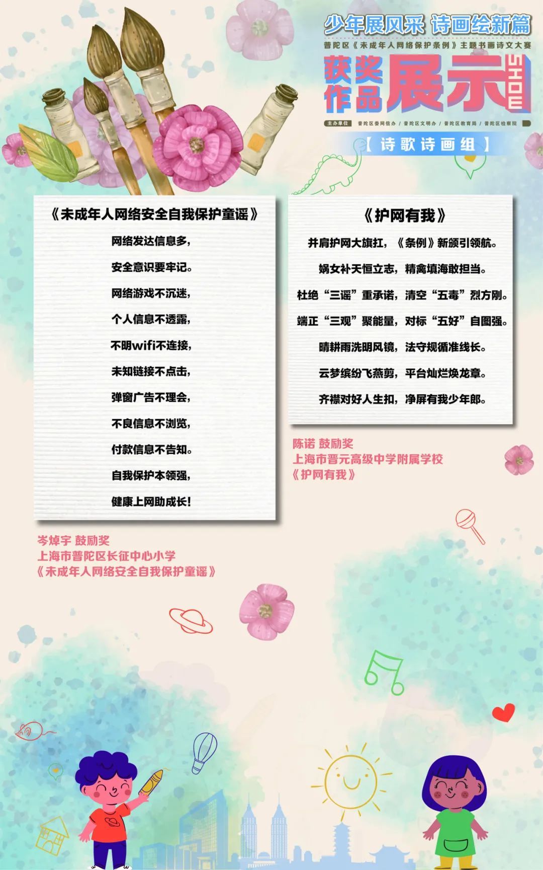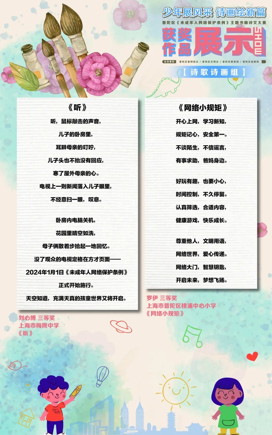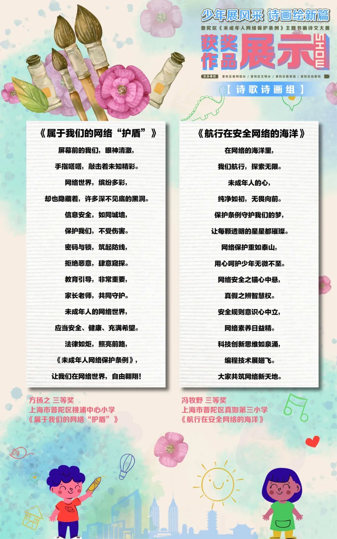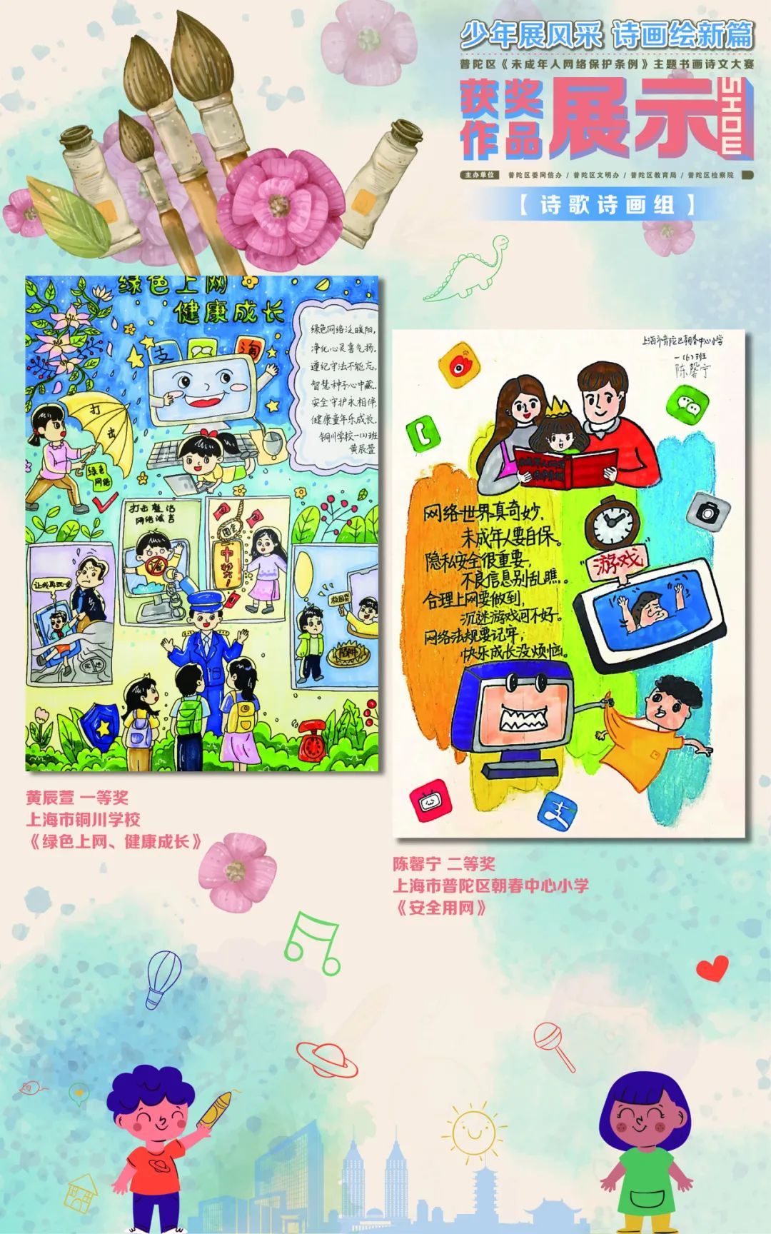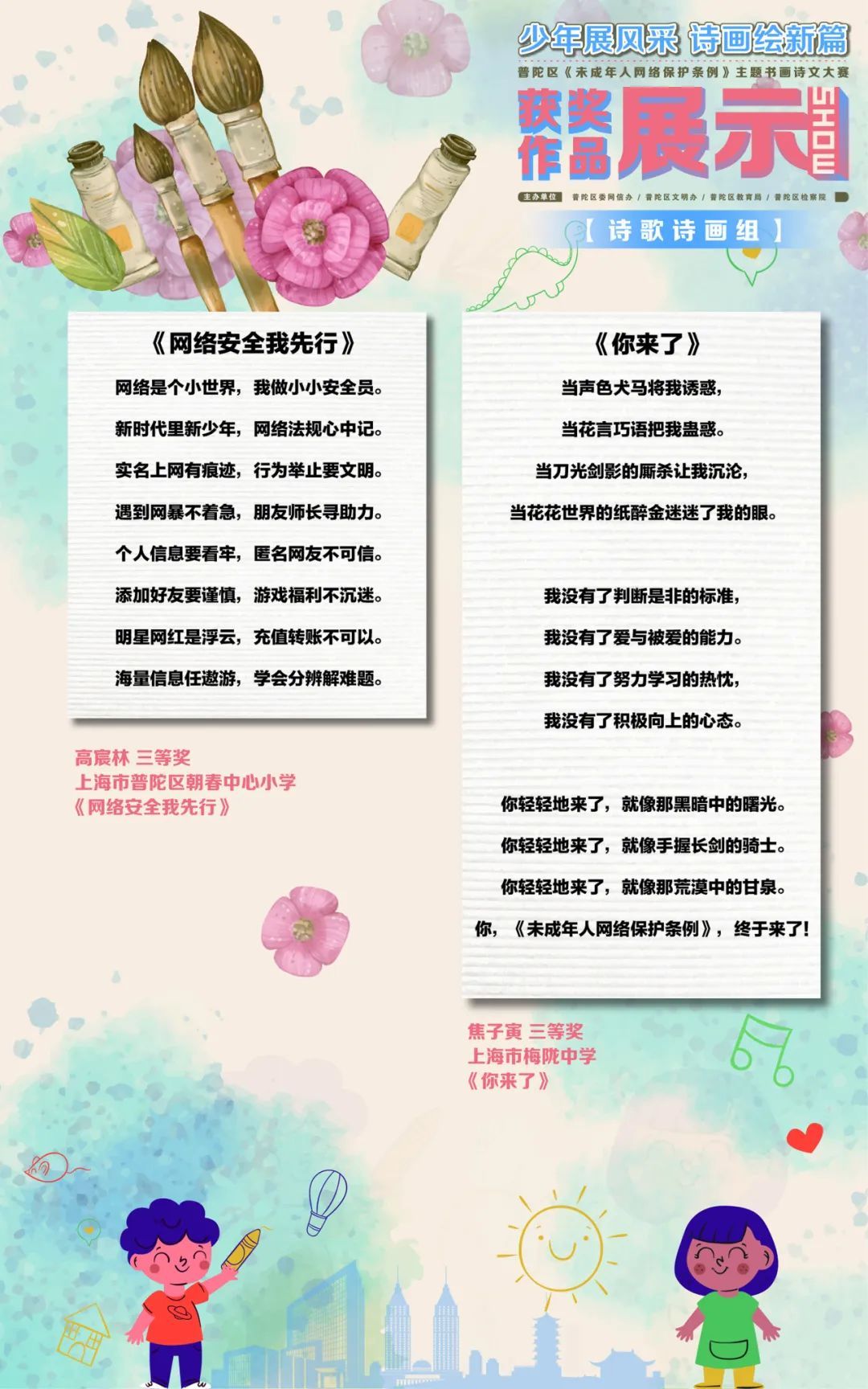 根据2024年1月1日正式施行的《未成年人网络保护条例》,为切实提高未成年人网络安全意识,营造有利于未成年人身心健康成长的网络环境,普陀区委网信办、普陀区文明办、普陀区教育局、普陀区检察院联合举办了“少年展风采 诗画绘新篇”普陀区《未成年人网络保护条例》主题书画诗文大赛,接下来让我们一起去看看那些获奖的优秀作品吧!