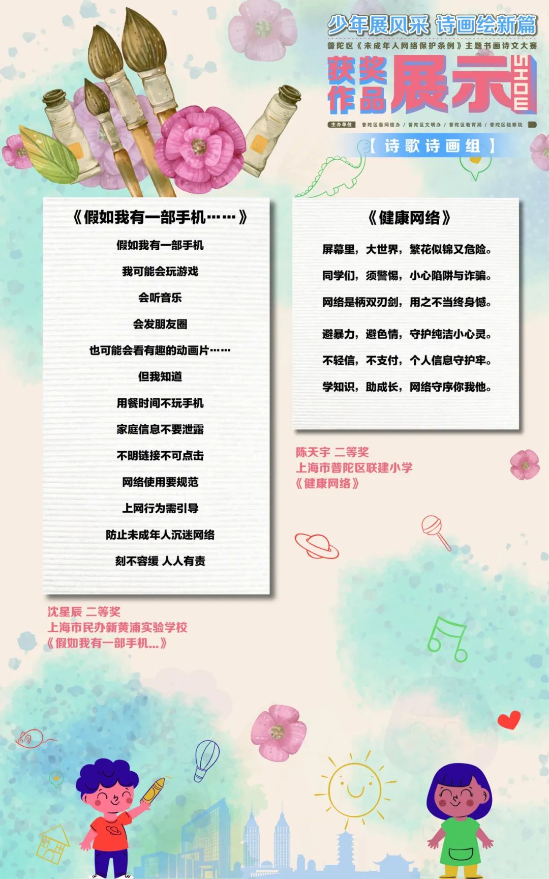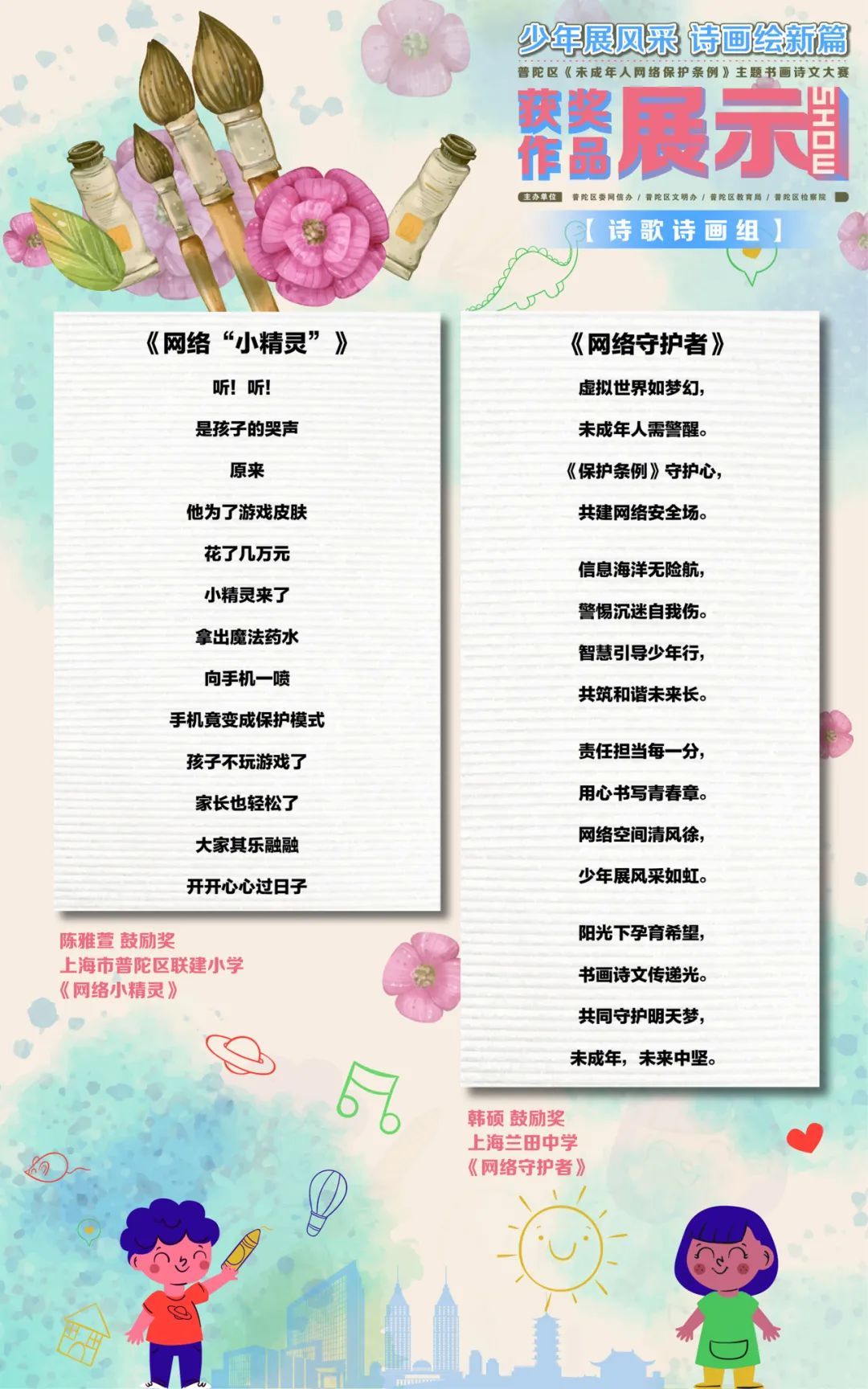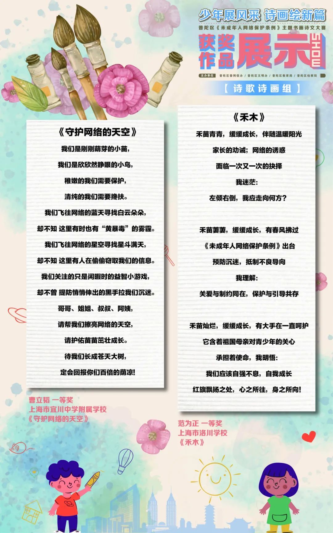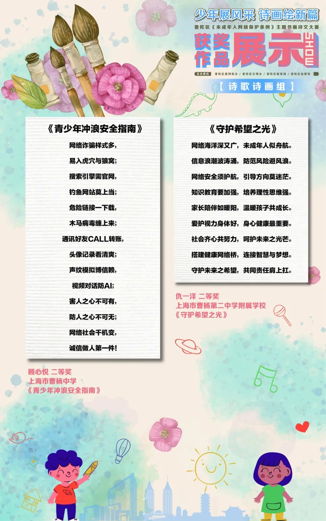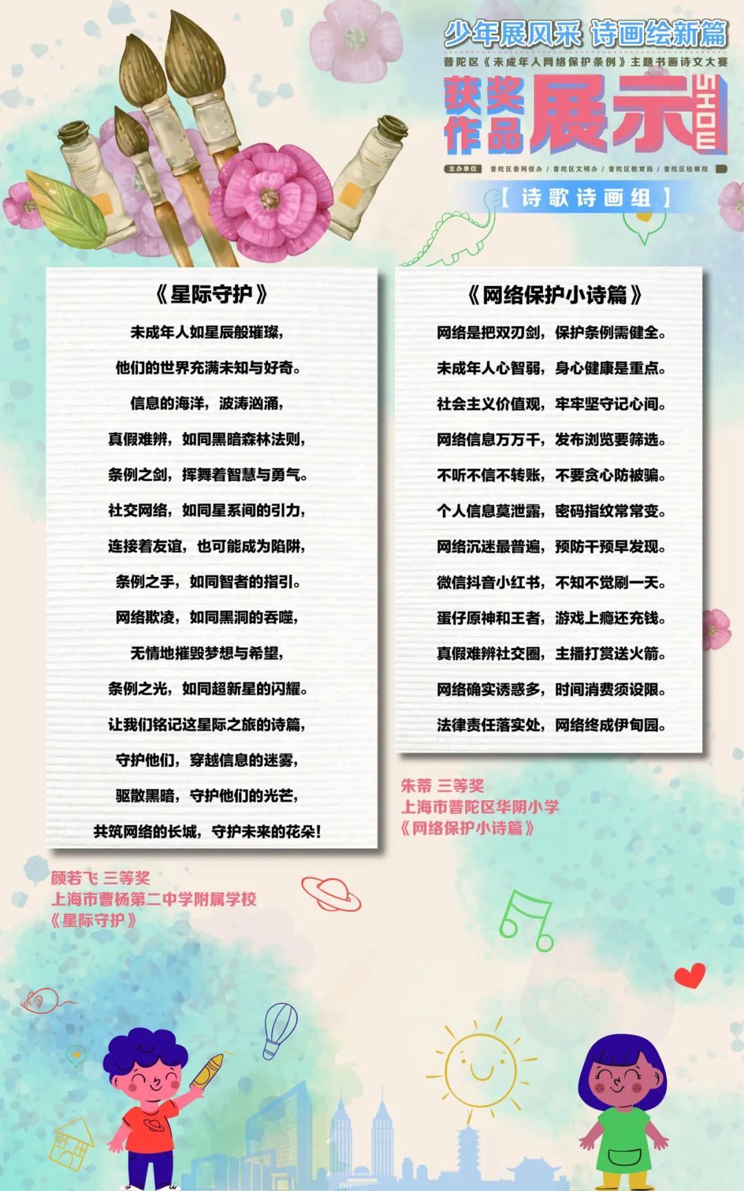 根据2024年1月1日正式施行的《未成年人网络保护条例》,为切实提高未成年人网络安全意识,营造有利于未成年人身心健康成长的网络环境,普陀区委网信办、普陀区文明办、普陀区教育局、普陀区检察院联合举办了“少年展风采 诗画绘新篇”普陀区《未成年人网络保护条例》主题书画诗文大赛,接下来让我们一起去看看那些获奖的优秀作品吧!