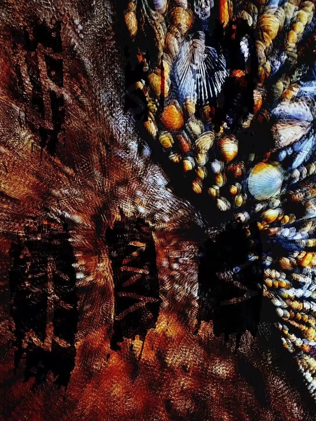 《冈身上的古遗址》这幅作品拍摄就是抽象融合了上海成陆年代海岸线遗迹贝壳砂层与陶文、原始瓷、青铜器等马桥时期的重要文化元素。