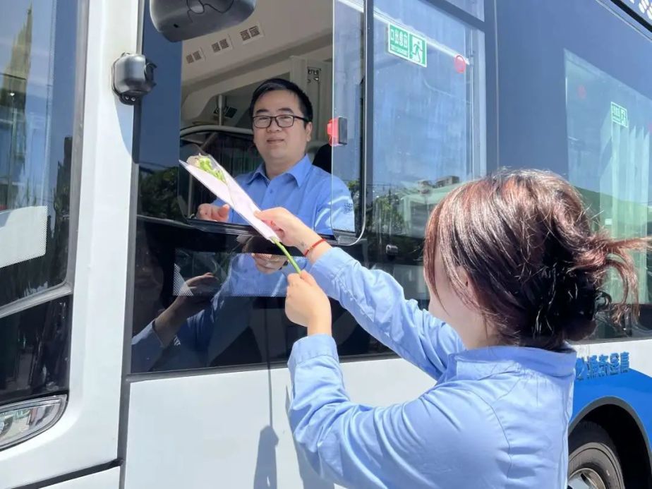在五莲路双桥路终点站,“全国工人先锋号”大桥四线班组提前为驾驶员准备了惊喜,调度员将一支鲜花送到正要发车的驾驶员手中,并对公交驾驶员的辛勤付出表示感谢。