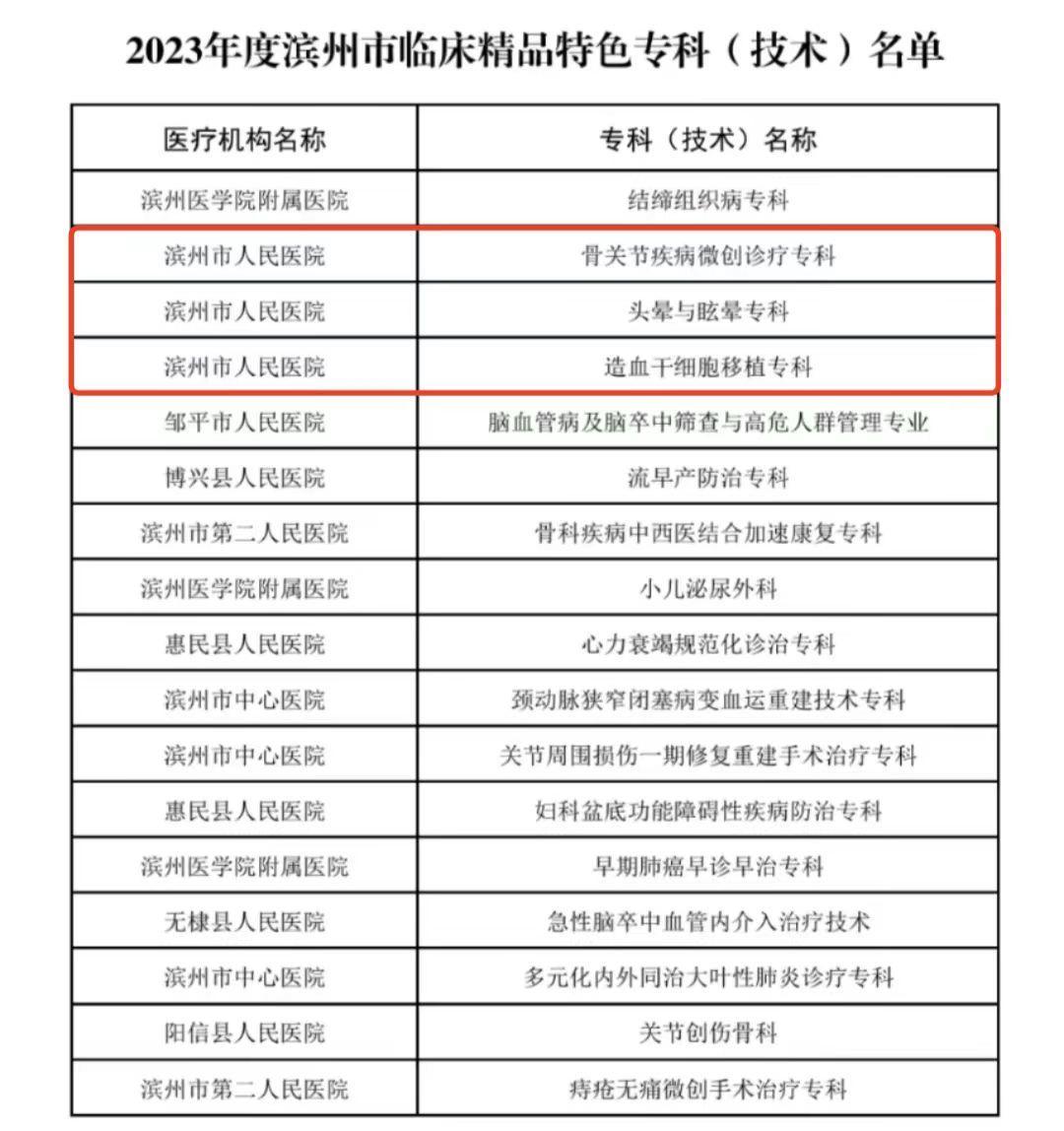 近日,滨州市卫生健康委组织开展2023年度市级临床精品特色专科申报和评审工作,山东第一医科大学附属滨州市人民医院(滨州市人民医院)造血干细胞移植专科、骨关节疾病微创诊疗专科、头晕与眩晕专科3个专科获评 2023 年度滨州市临床精品特色专科。