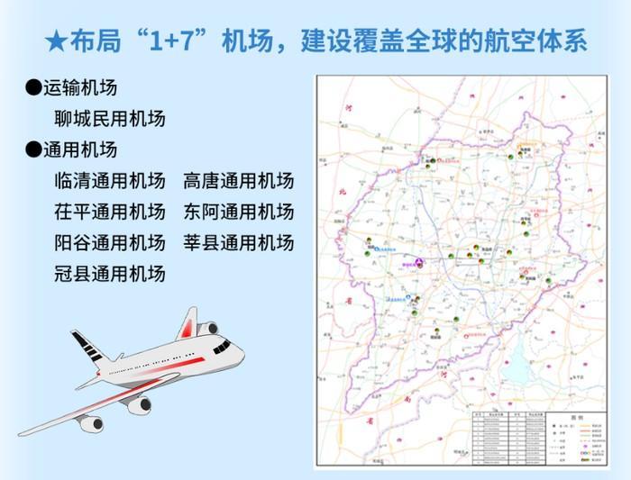 2023年1月,聊城市政府印发《聊城市综合立体交通网规划(2023—2035年)》,规划“1+7”机场布局方案,目标是“建设覆盖全球的航空体系”,其中的“1”是一座运输机场,即聊城民用机场。“7”则代表7座通用机场。