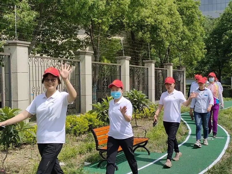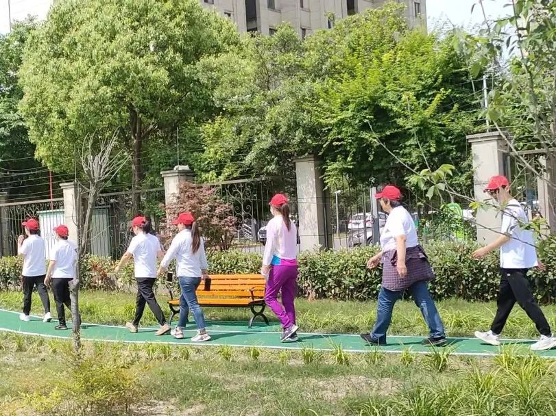 五月繁花似锦,绿荫如海,四团镇平南新苑小区门口的睦邻公园内正在举办一场健步走活动。大家身穿运动服,头戴小红帽,伴随着音乐,在崭新的跑道上体会徒步的魅力。