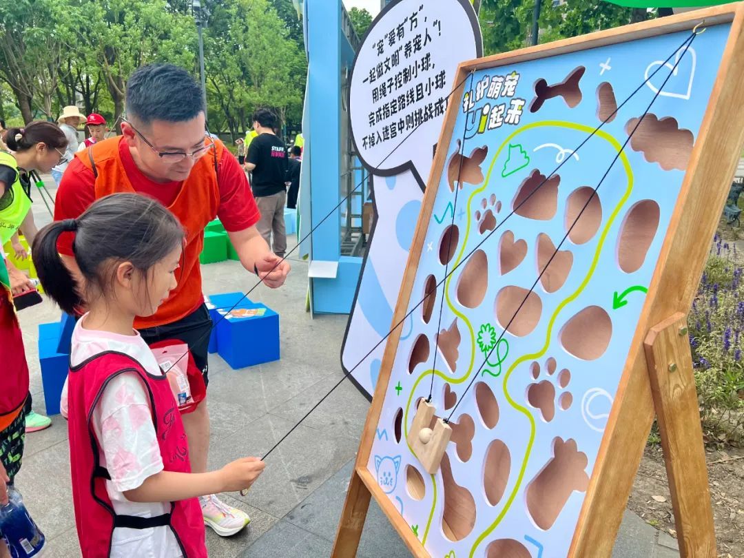 少年组的姚嘉熙拿到奖牌后,就迫不及待去“礼护萌宠”区参加互动游戏了。“要两手配合把木球移到终点,全程不能掉落,就像我们出门遛狗要捡拾宠物狗的便便,并扔在指定位置。”姚嘉熙介绍说。