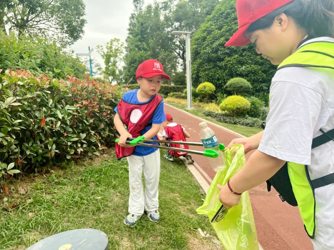 大朋友和小朋友们脚步不停、弯腰不停,从跑道边、草坪上、树丛里细心夹拾出烟头、果皮纸屑、塑料瓶等垃圾,“袋”走垃圾,留下文明。