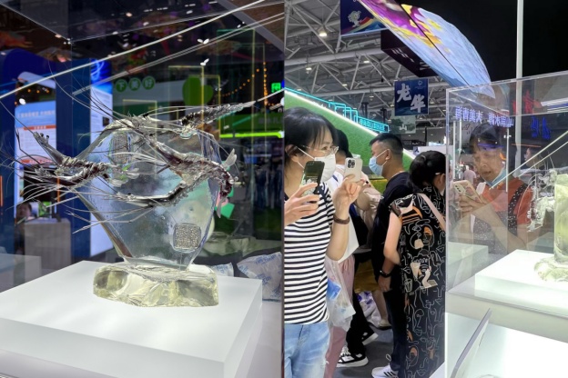 虾身晶莹剔透,虾节、触角、虾足伸展的姿态栩栩如生,让人爱不释手。“这是琉璃吗?”“是水晶吧!”观众之间的对答让来自青岛的糖艺师崔久祥忍俊不禁,他介绍,这是糖画《墨虾图》,用白砂糖、墨鱼汁制作而成,《墨虾图》的灵感源于国画,把水墨渲染融入糖塑技艺,凸显国风审美意境。