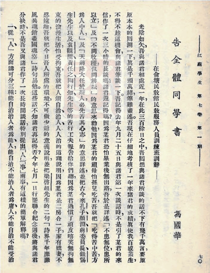 1934年9月,冯国华到俞塘主持民教服务人员培训班工作,发表《告全体同学书》,谈读书做事爱国一体化。1935年1月起,与张劲夫一起创办“乡村新生活实验区”。1936年4月起,冯国华赴镇江登云山接受三个月正规军事训练。这是一次青年精英的聚会,一场浴火重生的磨炼。眼看国难临头,冯国华全身心地学习武艺,磨练意志,迅速地由文质彬彬的“校长”蜕变为英气勃发的“铁汉”。