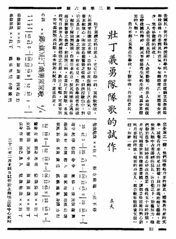 1937年3月15日,在冯国华的支持下,《社教通讯》月刊发表顾振的《壮丁义勇队队歌的试作》一文及歌谱。顾振,字真火,陈行人,时任瓶山分馆军事教员(后任抗日游击队负责人,为革命烈士)。