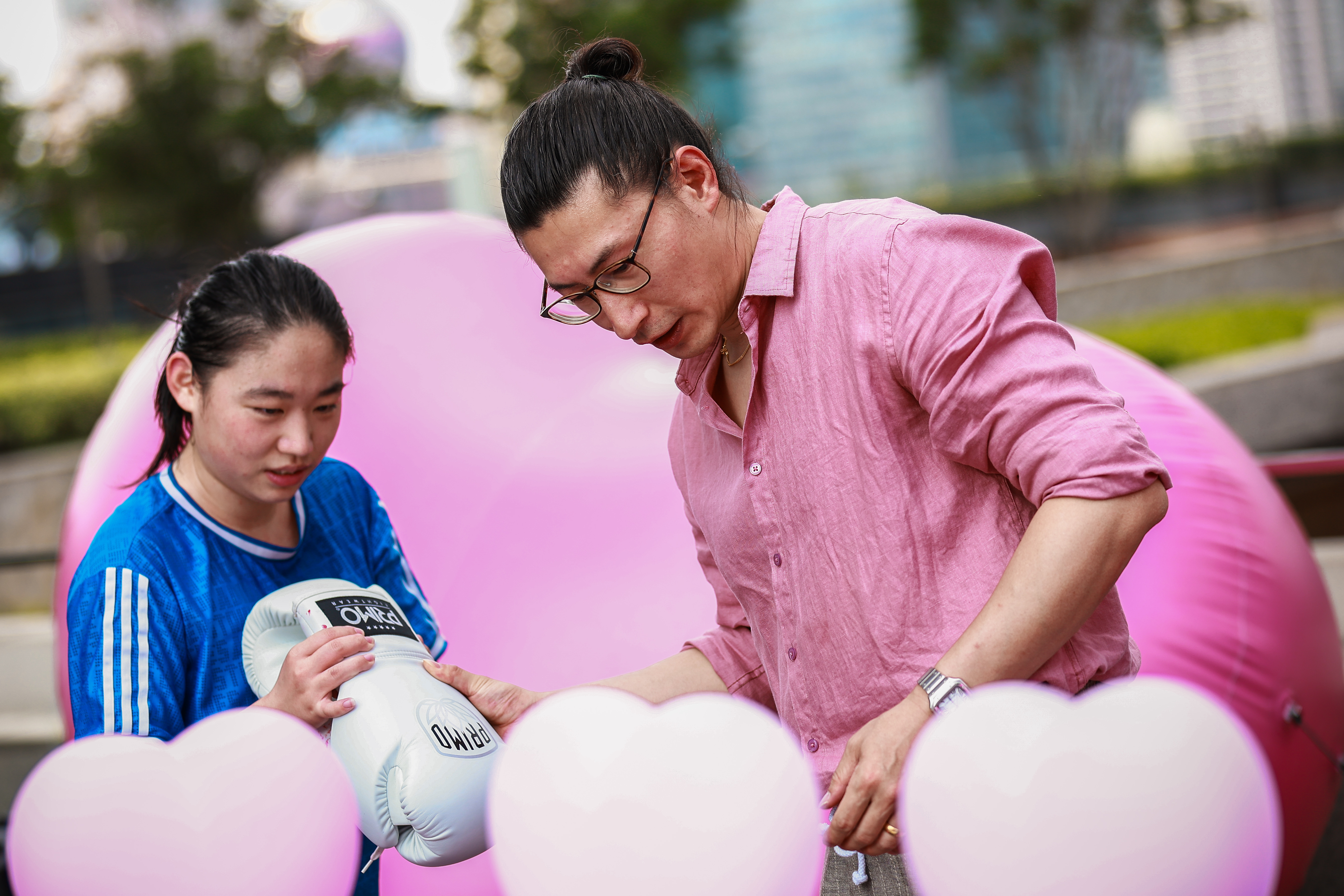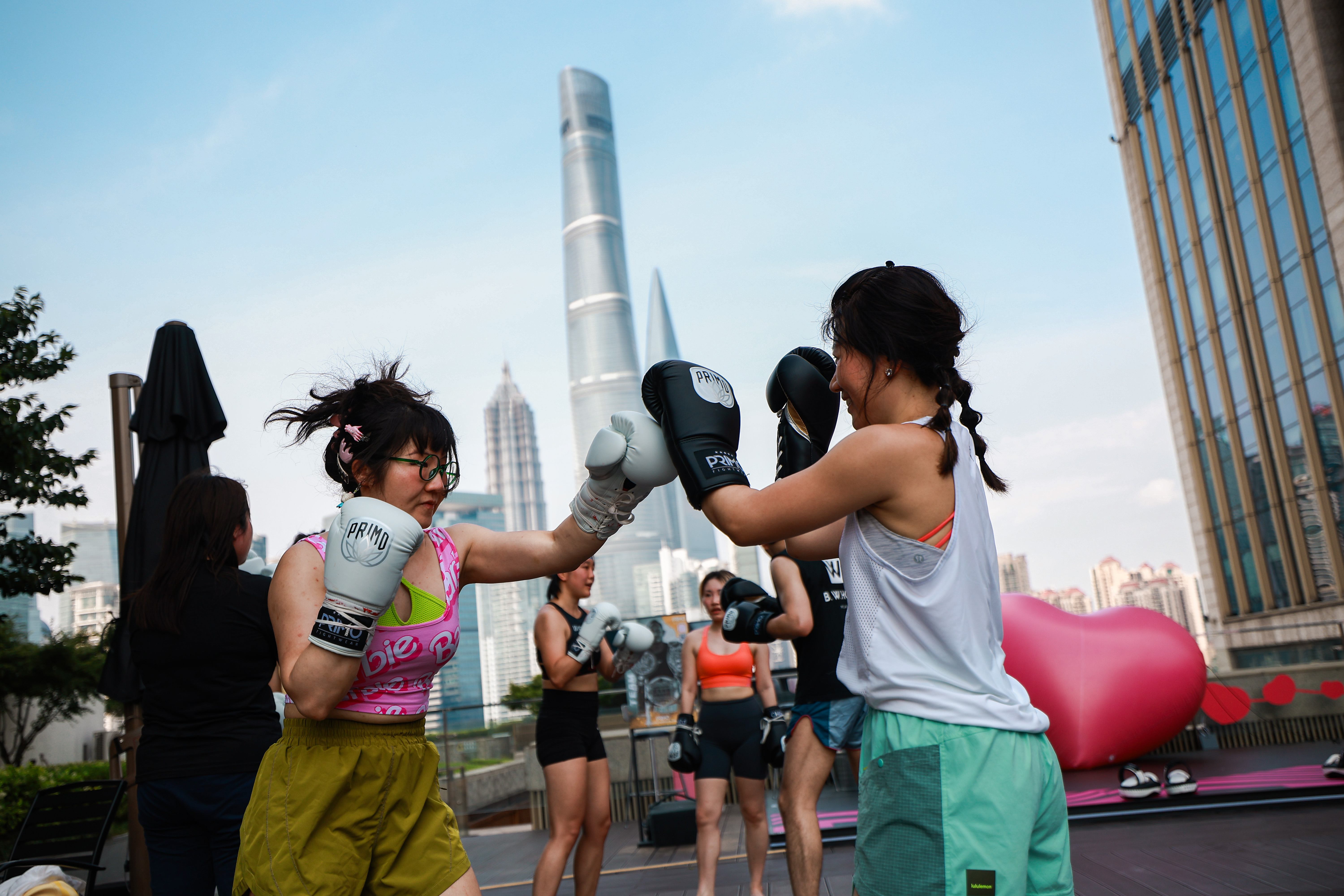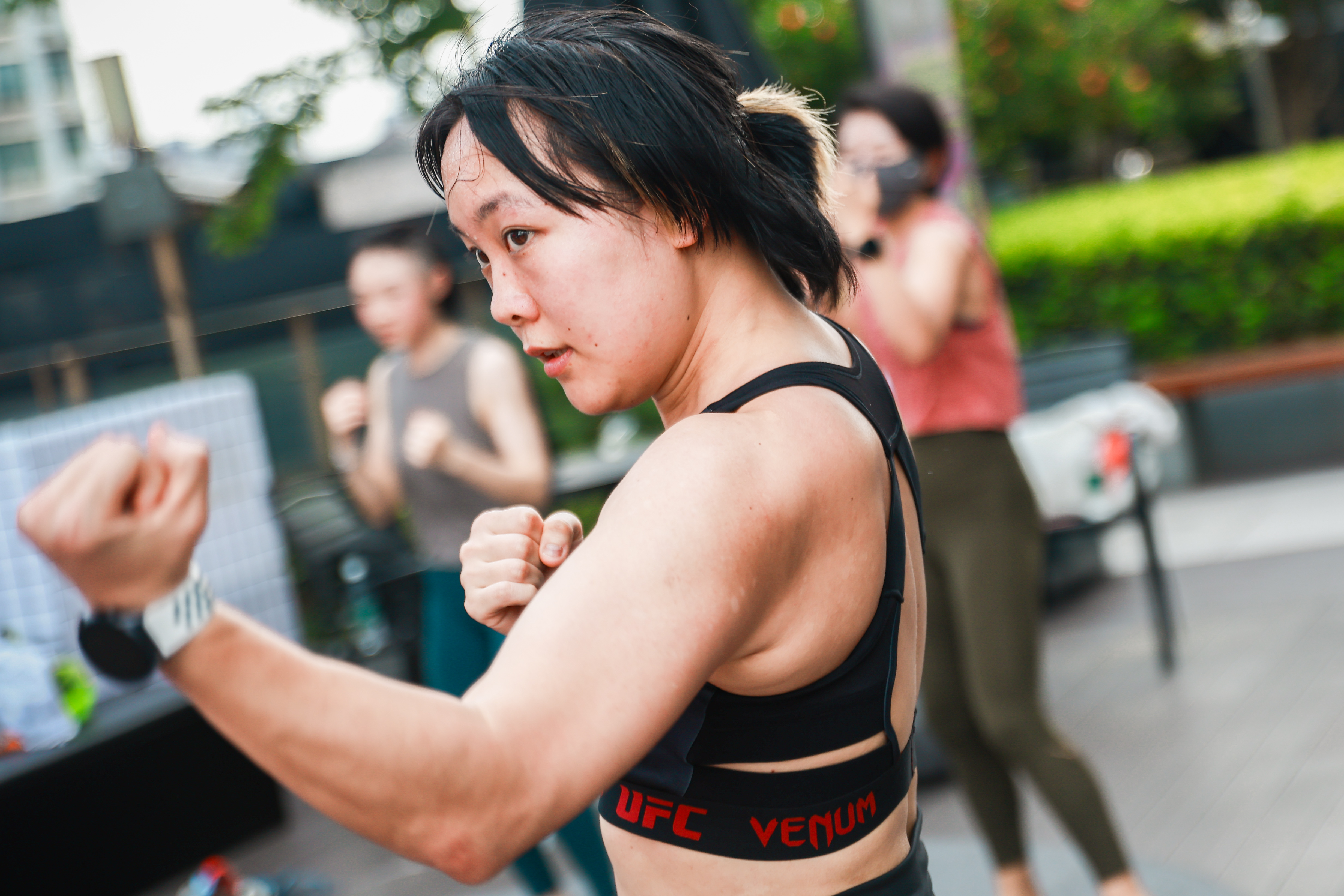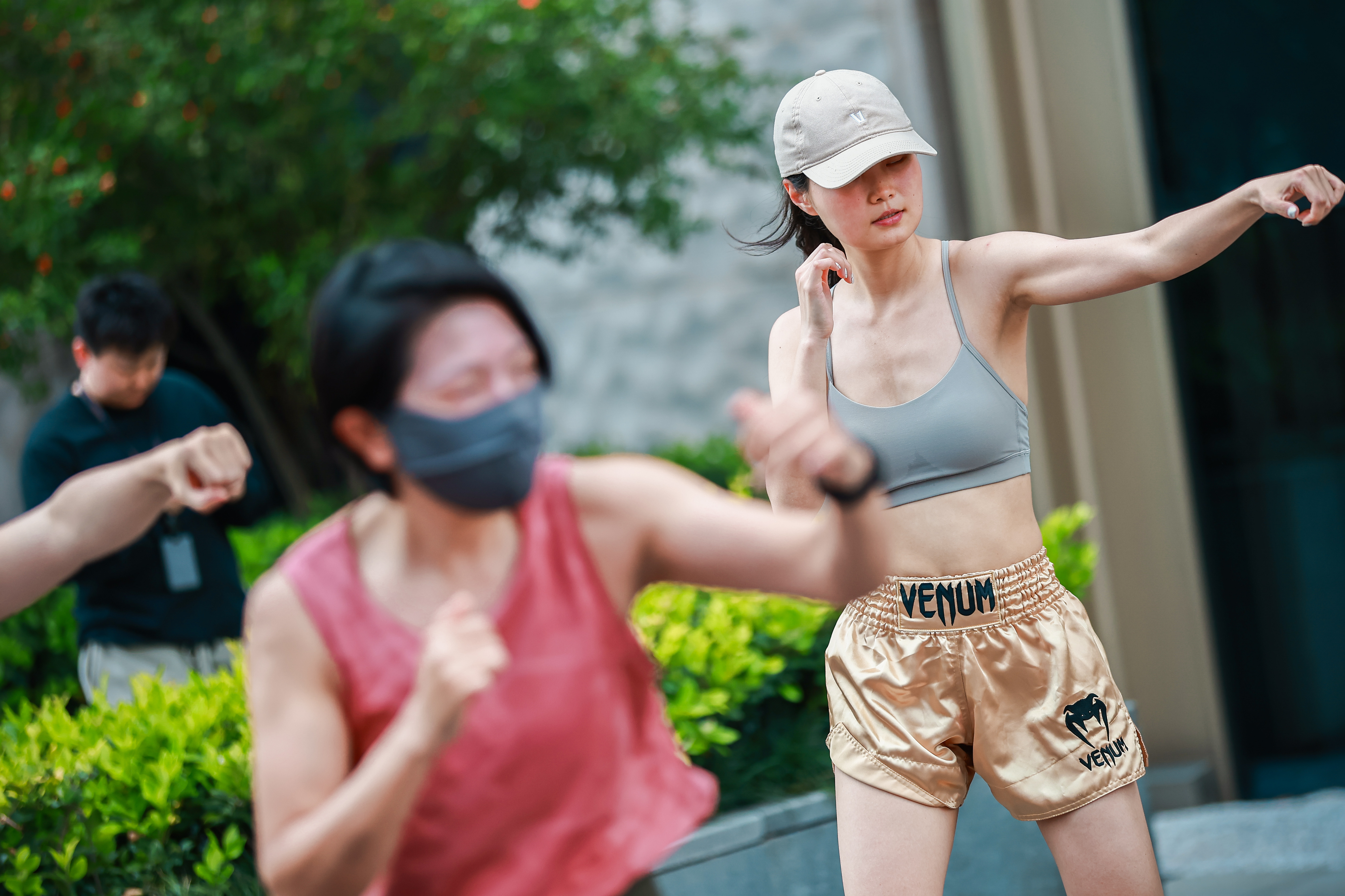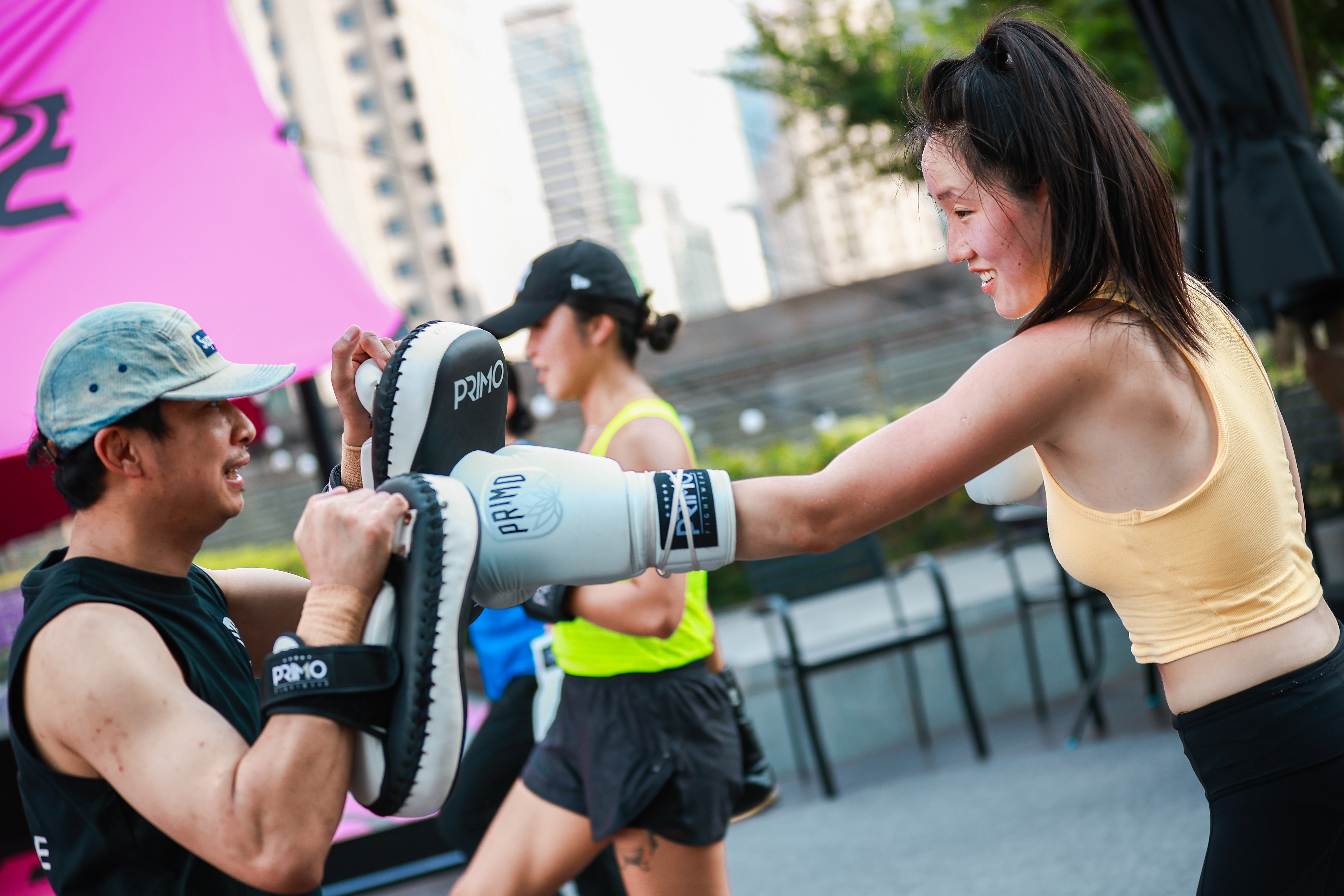 26日下午,在坐拥一线江景的BFC南区5楼露台,开启了一场愉悦身心的泰拳公开课。在专业教练的指导下,近20余名泰拳新手、爱好者们在一览无余的外滩江景露台视野中,感受江风拂面时的酣畅淋漓。