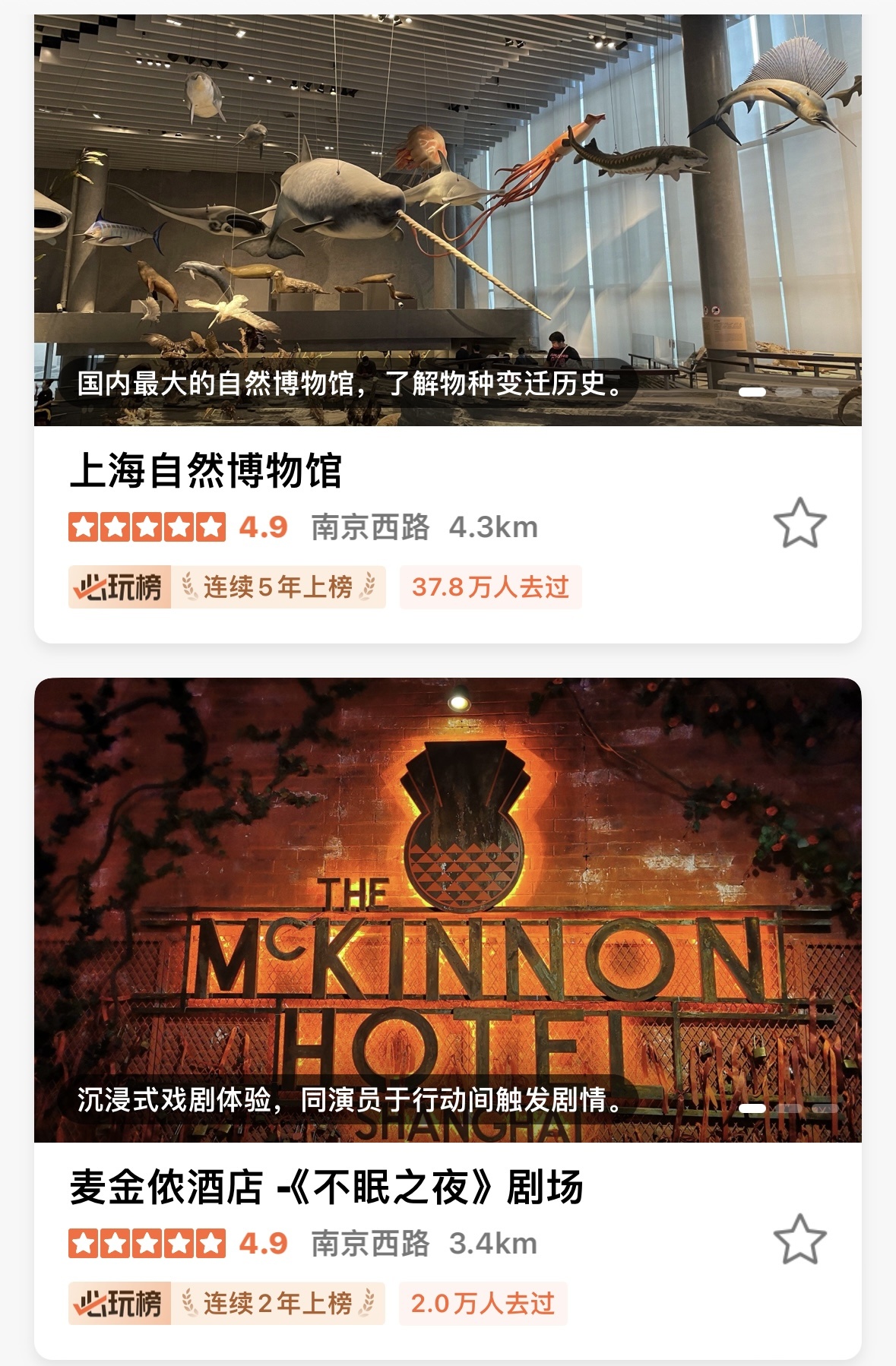 静安上榜游玩地为5个,排名全市第三,分别是上海自然博物馆、静安寺、上海四行仓库抗战纪念馆、麦金侬酒店-《不眠之夜》剧场和Project W威士忌·鸡尾酒,涵盖亲子玩乐、历史古迹、展览展馆、夜生活等多样化出游场景,满足各类人群的出游需求。