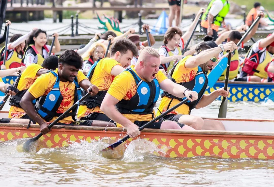 “喧江雷鼓鳞甲动,三十六龙衔浪飞。”5月25日,华东理工大学奉贤校区通海湖上热闹非凡。2024年“感知中国”——第十四届上海高校外国留学生龙舟赛暨第二届长三角高校外国留学生龙舟邀请赛隆重开赛。34支队伍、106个国家、765名参赛选手,来自复旦大学、南京理工大学、浙江大学、中国科学技术大学等江浙沪皖地区的留学生龙舟队挥桨竞逐,吸引了数千名观众汇集在通海湖畔一睹盛况。 随着一声令下,龙舟如离弦之箭,水面上留下一道道波痕,现场气氛瞬间点燃。“轻凫飞燕各如云,飞桨逐浪竞风流”,划手们个个斗志昂扬,挥浆疾驰,岸边的观众不时为龙舟队员们呐喊助威,现场人声鼎沸、热闹非凡,不同的肤色、相同的笑颜,绘成了一幅文化交融沟通的精彩画卷。 “去年我们的成绩大概在一分十几秒,今年我们大概控制在五十多秒。”浙江工业大学留学生龙舟队领队穆斯塔发(埃及)对今年有长足进步的成绩十分欣喜,也感受到今年现场更加热闹的氛围。“感觉是来自四大洋的不同的脸、不同的肤色都在这里,大家都回来了,我觉得这是很明显的一个变化。” 现场,来自一带一路沿线国家的留学生面孔数量可观。据了解,作为赛事主办方之一,华东理工大学十分重视一带一路沿线国家的教育合作,十年间,吸引了大批具备优秀学术背景、较强学习和科研能力的国际学生来校学习,重点聚焦于石油化工、绿色能源等领域。华东理工大学国际教育学院院长李霄鹏表示,“据不完全统计,目前在全校的一带一路沿线国家的留学生占比已经超过60%,其他学校的这个比例也相差不大。” 在华理,每年都有不少留学生加入龙舟队,来自沙特阿拉伯的索非凡就是其中之一。作为今年新上任的队长,他表示能和来自世界各地的人们,一起竞技、一起感受并传播中国文化,非常荣幸。“今年是我第二次参赛,但是今年当上了队长,我们经历了很多事情,通过团队合作和努力也获得了回报,总的来说这是一段难忘的经历。” 据悉,上海高校外国留学生龙舟赛自2008年开始落户华理,已成为上海高校外国留学生校园文化生活的一项经典活动。近年来,该赛事的规模不断扩大,已扩展至江浙皖等长三角地区。今年,在国家留学基金委的大力支持下,该赛事升格为“感知中国”系列活动,进一步丰富了“留学中国”的品牌内涵。今年,赛事由国家留学基金管理委员会、上海教育委员会、上海教育国际交流协会国际学生教育研究工作委员会主办,华东理工大学承办,中国银行上海市分行作为支持单位。 “未来我们会进一步升级赛事为长三角一体化,从留学生国际教育方面做出扎实的贡献。”华东理工大学国际教育学院院长李霄鹏表示,未来长三角龙舟赛有机会在江、浙、皖、沪这三省一市中轮流举办,让更多的学生和学校感受到龙舟赛的魅力。 经过紧张激烈的角逐,最终华东师范大学拔得头筹,亚季军分别由上海海事大学和南京理工大学获得。