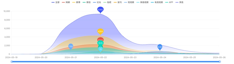 5月19晚事发后,舆情在5月20日经媒体报道后热度迅速提升,最终在5月22日达到顶峰,当日即产生9300余篇相关信息。随后,事件热度逐渐走低。