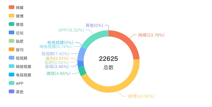 从舆情信息分布情况看,各类媒体报道总数量为22000余条,微博(占比43.38%)是主要传播平台,其次是网媒(占比23.79%)、APP(占比16.31%)、短视频(占比7.42%)、微信(占比4.85%)。