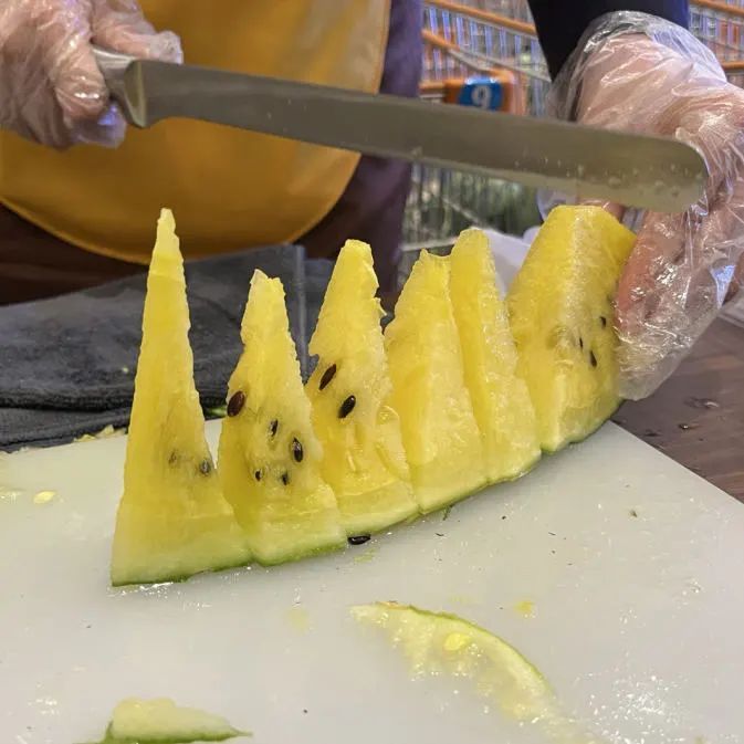 “我最爱吃西瓜了,这里的都很好吃,鲜甜水润。”“平时都是红瓤的吃得更多一点,这次能吃到这么多黄瓤西瓜,感觉不仅甜,而且果味也很浓郁。”……