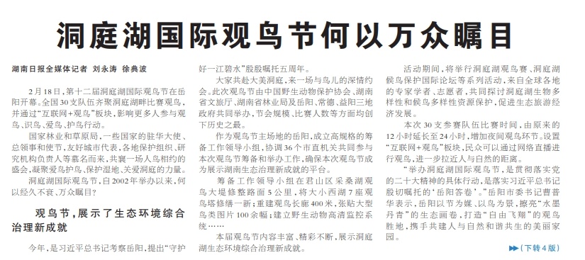 《湖南日报》曾于2023年2月19日头版推出文章《洞庭湖国际观鸟节何以万众瞩目》,文中写道:“全国 30 支队伍齐聚洞庭湖畔比赛观鸟, 并通过‘互联网+观鸟’板块,影响更多人参与观鸟、识鸟、爱鸟、护鸟行动。”