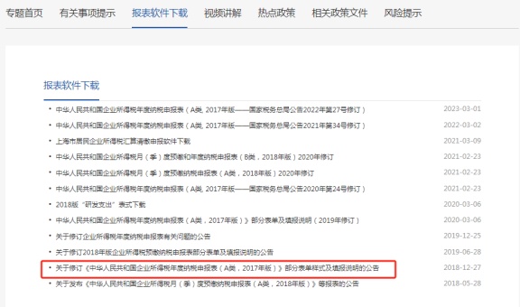 答:您可以登录上海市税务局官网首页,依次点击【企业所得税汇算清缴专栏】——【报表软件下载】——【关于修订《中华人民共和国企业所得税年度纳税申报表(A类,2017年版)部分表单样式及填报说明的公告》】查看填表说明。