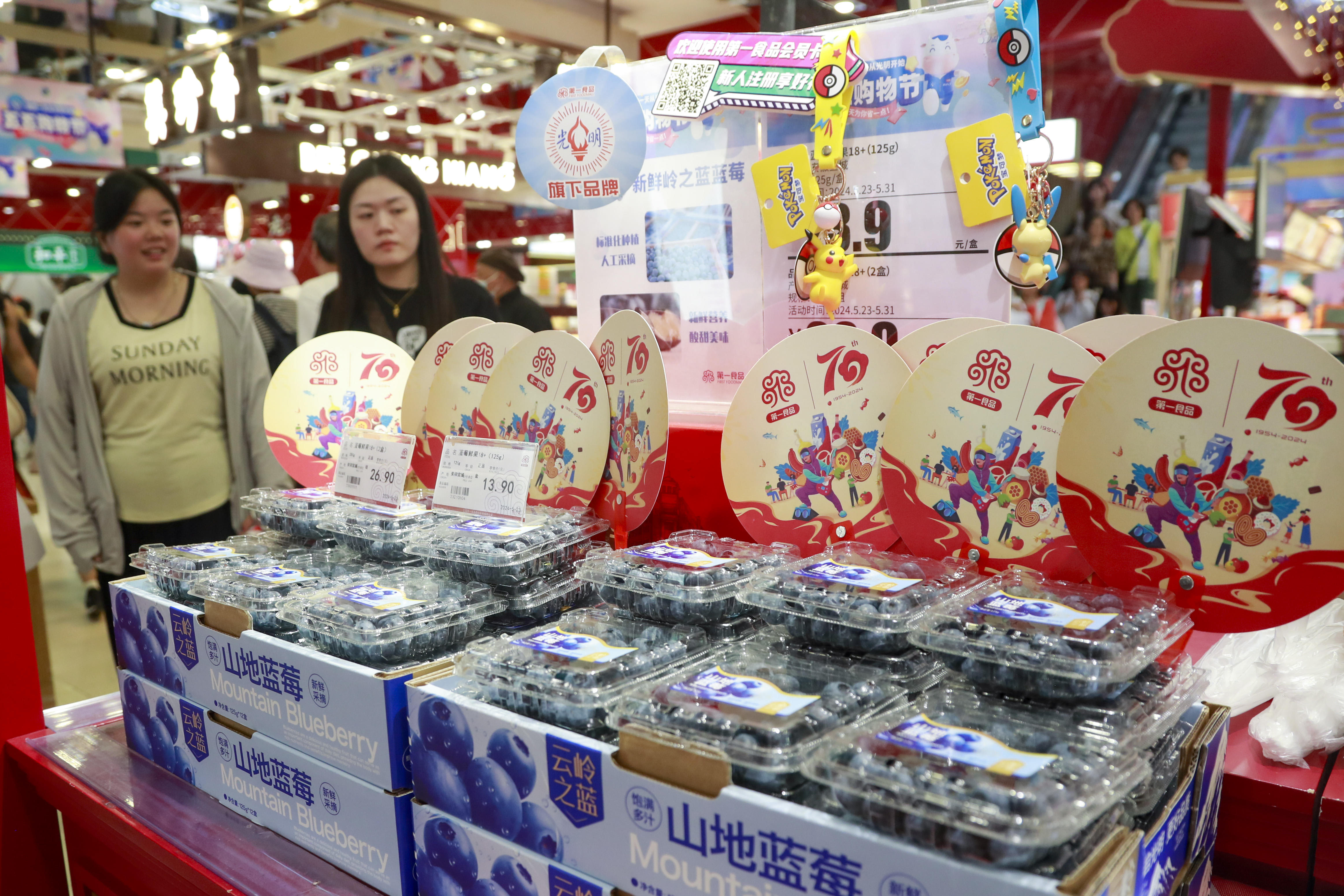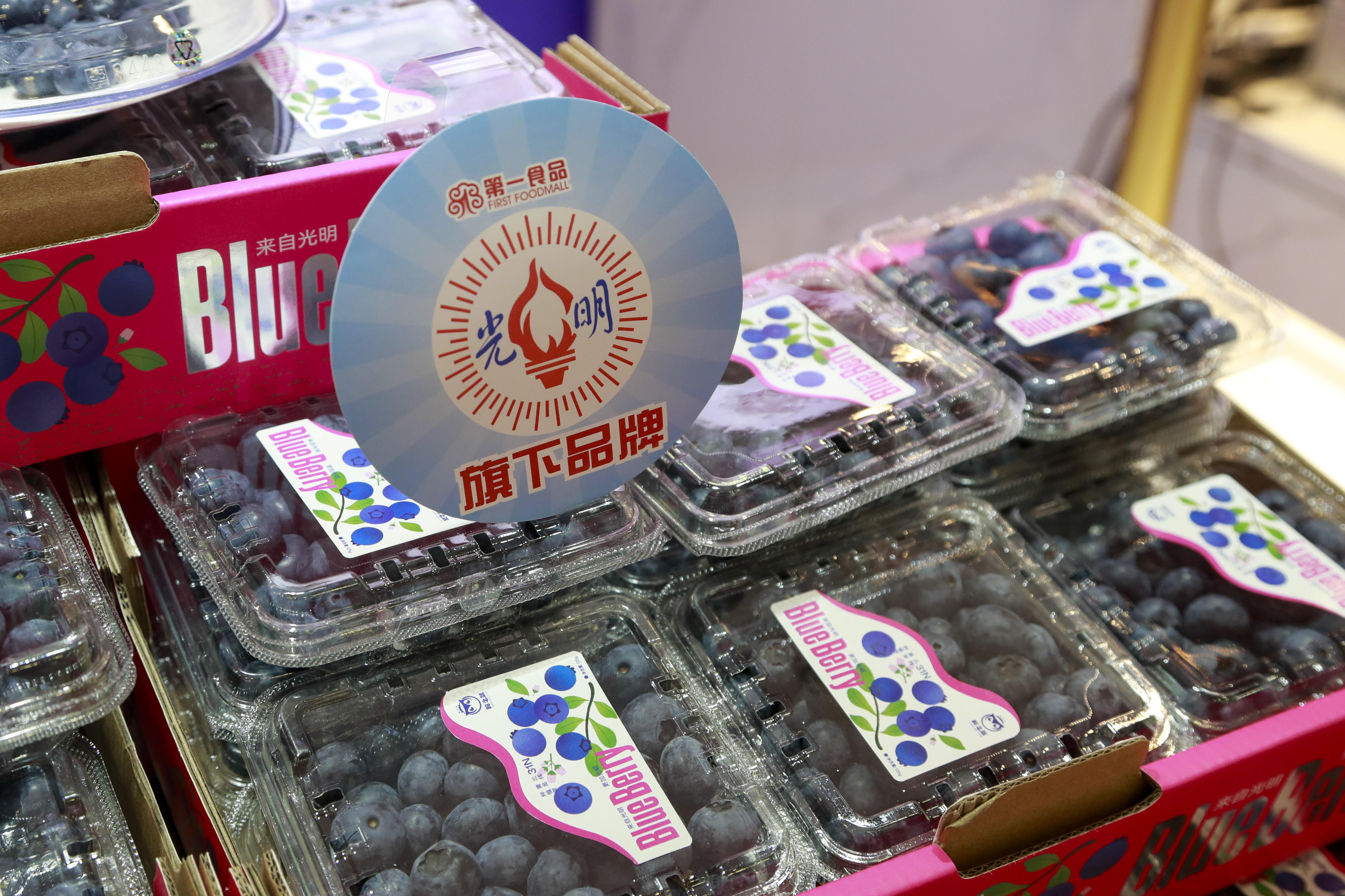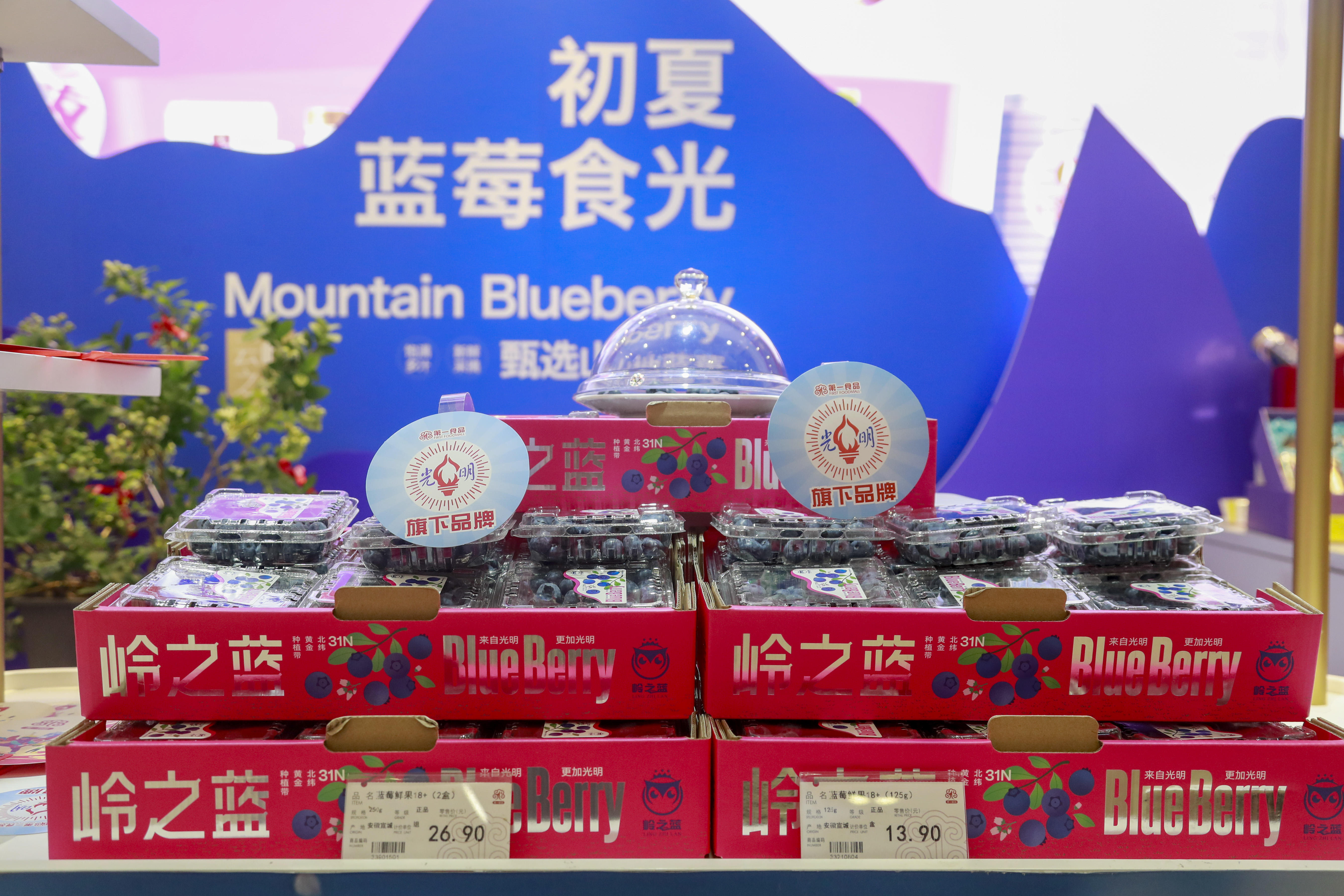 本次蓝莓节是第一食品首次尝试单品推广活动,所有产品全由白茅岭农场蓝莓基地直接发货,人工采摘、冷链运输更是为“新鲜”上了一层双保险。在第一食品商店南京东路旗舰店(下文简称“南东店”)与杨浦万达店设置的白茅岭“岭之蓝”蓝莓专区内,陈列蓝莓鲜果开展“大果抢'鲜’购”活动,并配合“五五购物节”设置了满减活动、多档商品组合促销及买赠活动。除此之外,南东店一楼还专门摆放了一棵蓝莓树盆栽,为本届购物节增加全新的销售亮点。
