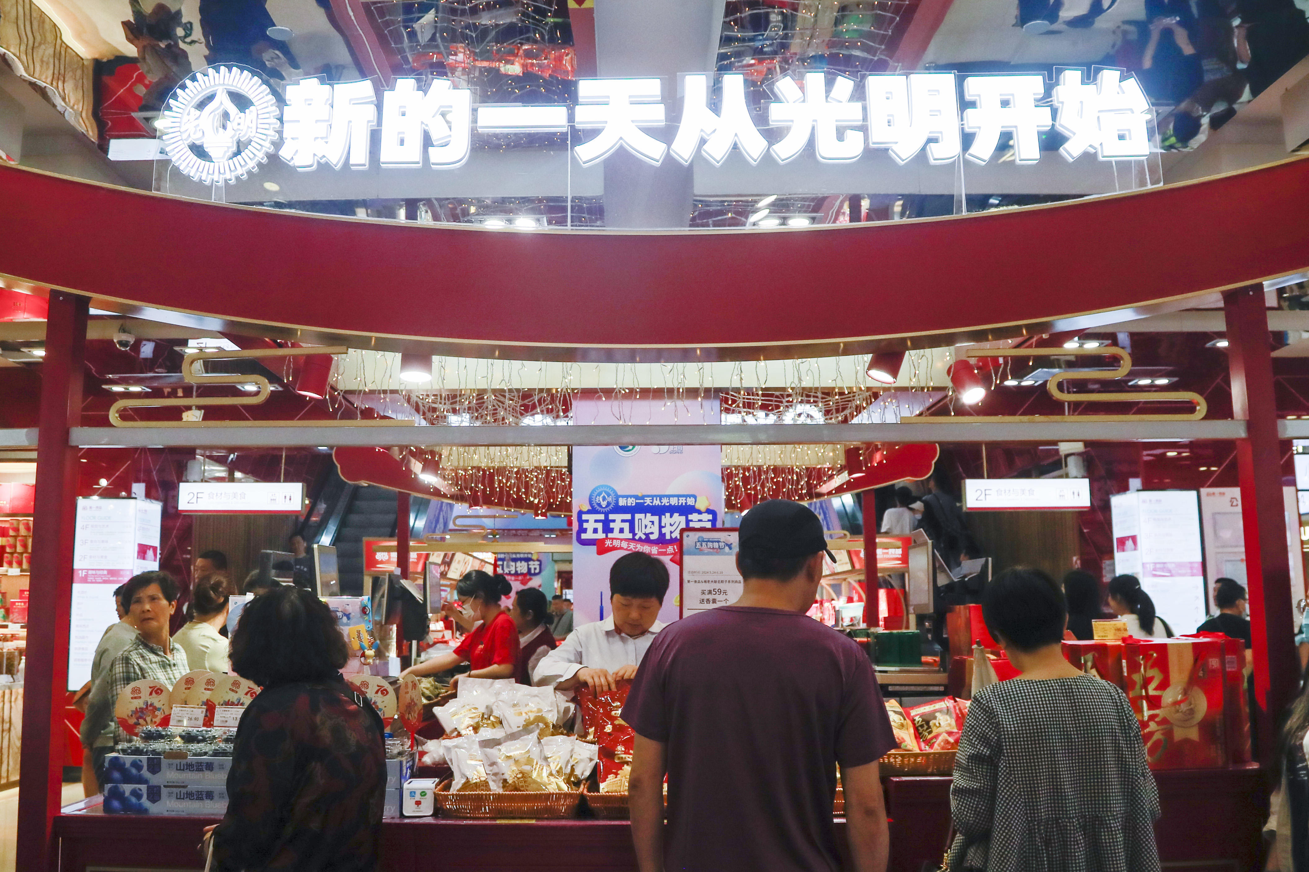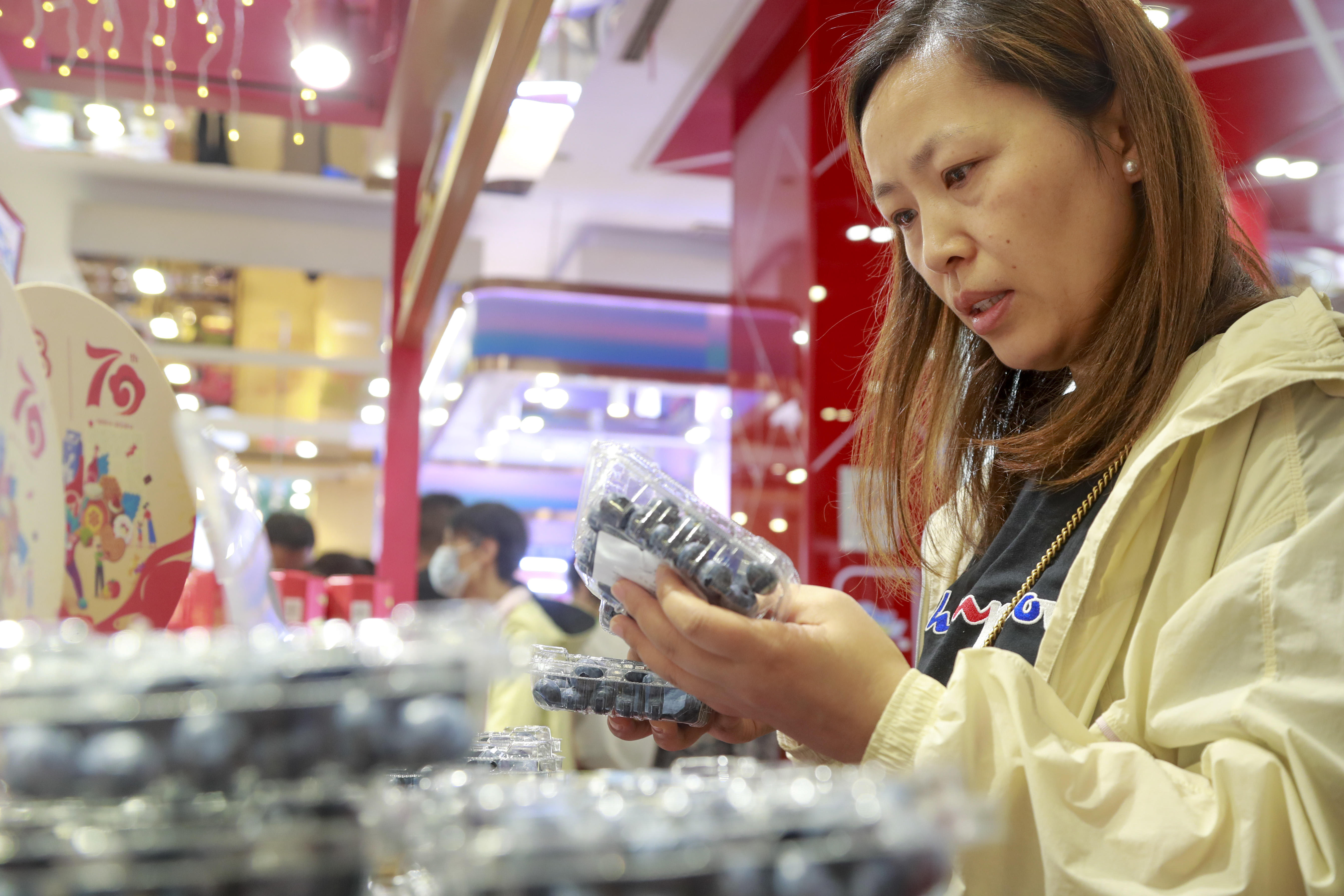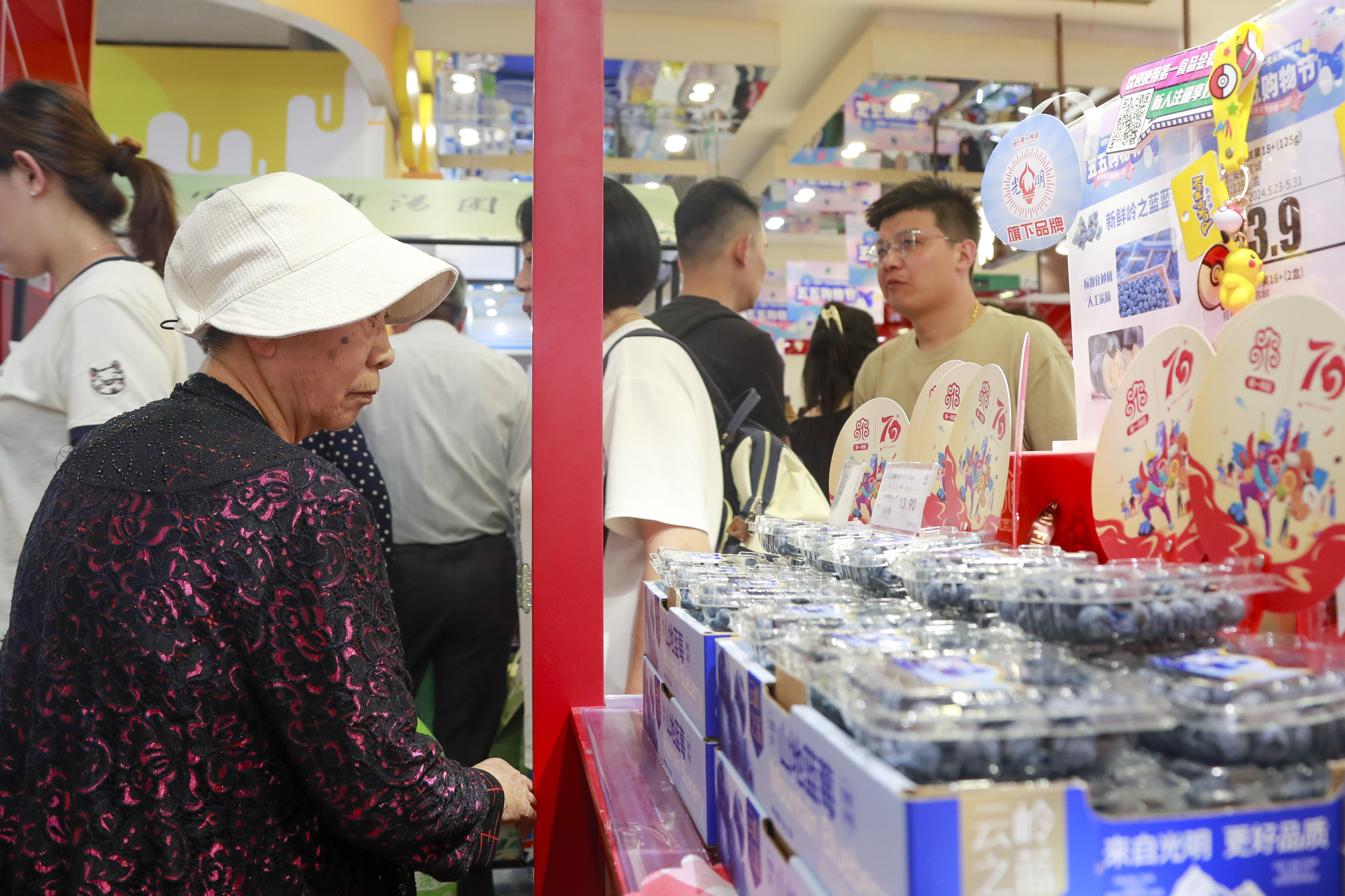 本次蓝莓节是第一食品首次尝试单品推广活动,所有产品全由白茅岭农场蓝莓基地直接发货,人工采摘、冷链运输更是为“新鲜”上了一层双保险。在第一食品商店南京东路旗舰店(下文简称“南东店”)与杨浦万达店设置的白茅岭“岭之蓝”蓝莓专区内,陈列蓝莓鲜果开展“大果抢'鲜’购”活动,并配合“五五购物节”设置了满减活动、多档商品组合促销及买赠活动。除此之外,南东店一楼还专门摆放了一棵蓝莓树盆栽,为本届购物节增加全新的销售亮点。