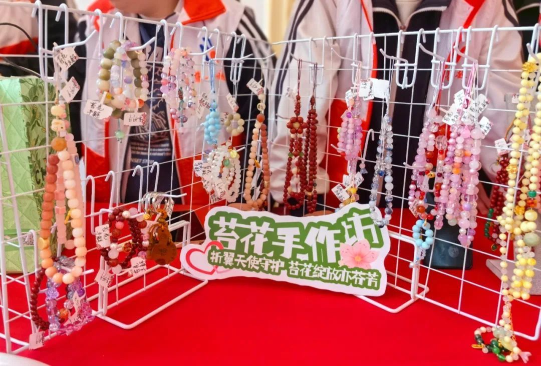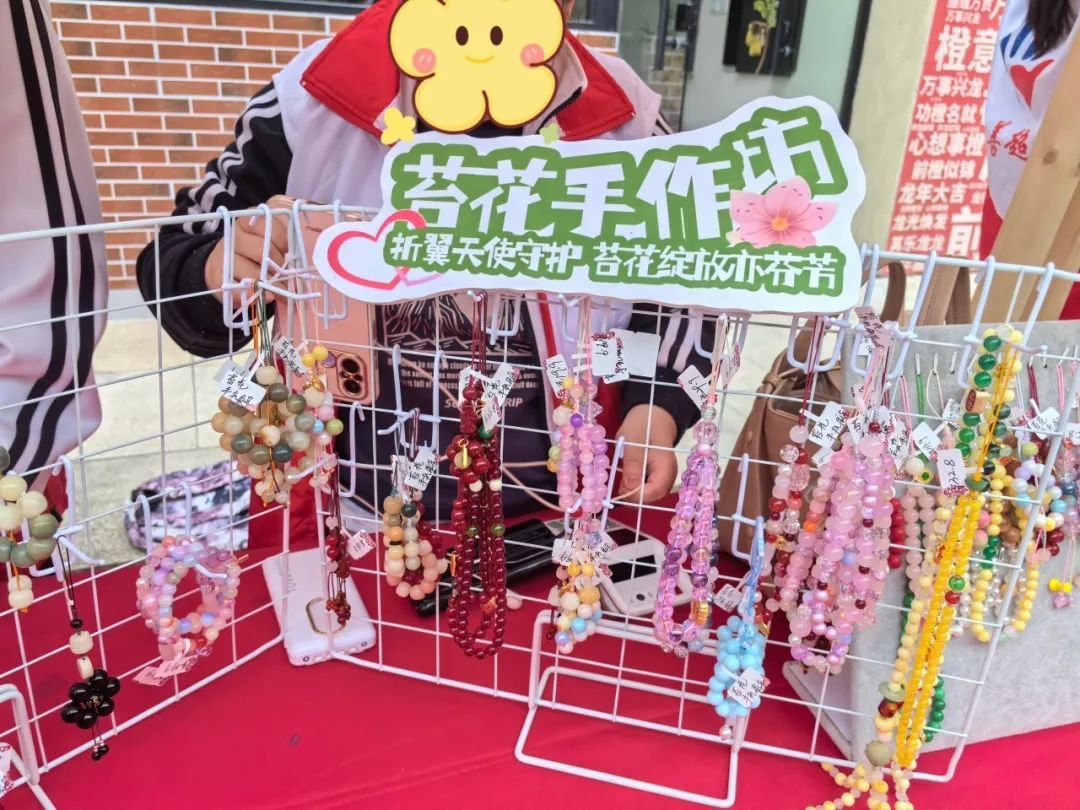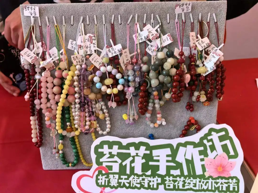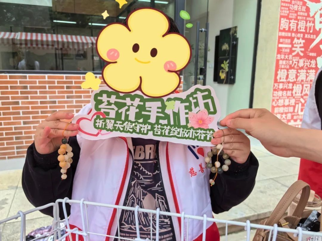 几场义卖下来,“苔花”手作坊的孩子们从一开始的手足无措,逐渐变得游刃有余。如今,孩子们已经能够熟练地售卖手串。他们分工明确、配合默契,整个售卖过程有条不紊。每当有顾客前来选购时,他们都会热情地迎上前去介绍自己的作品。看到顾客满意的笑容和手中精美的串珠时,他们的心中充满了喜悦和成就感。