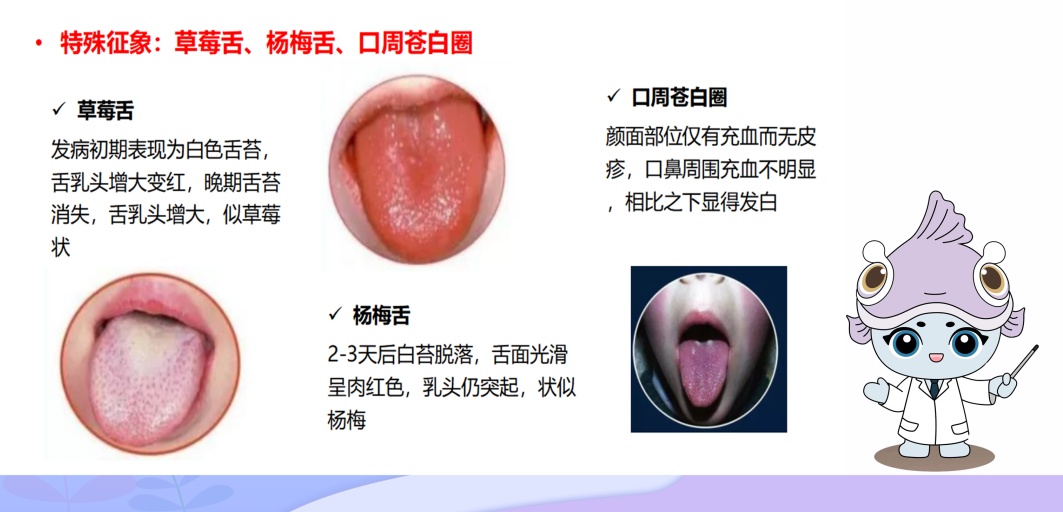部分患者可出现“草莓舌”“杨梅舌”等。