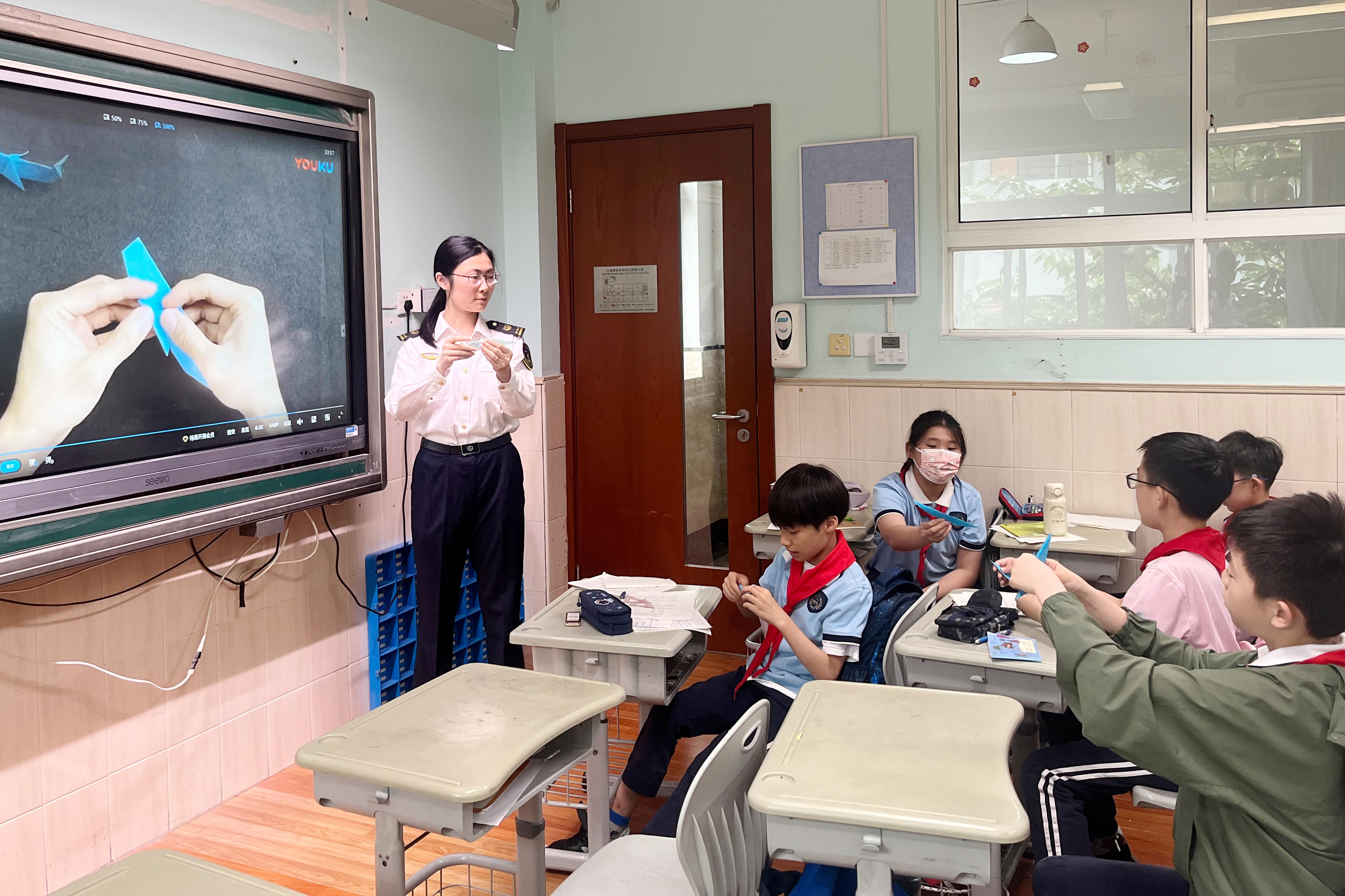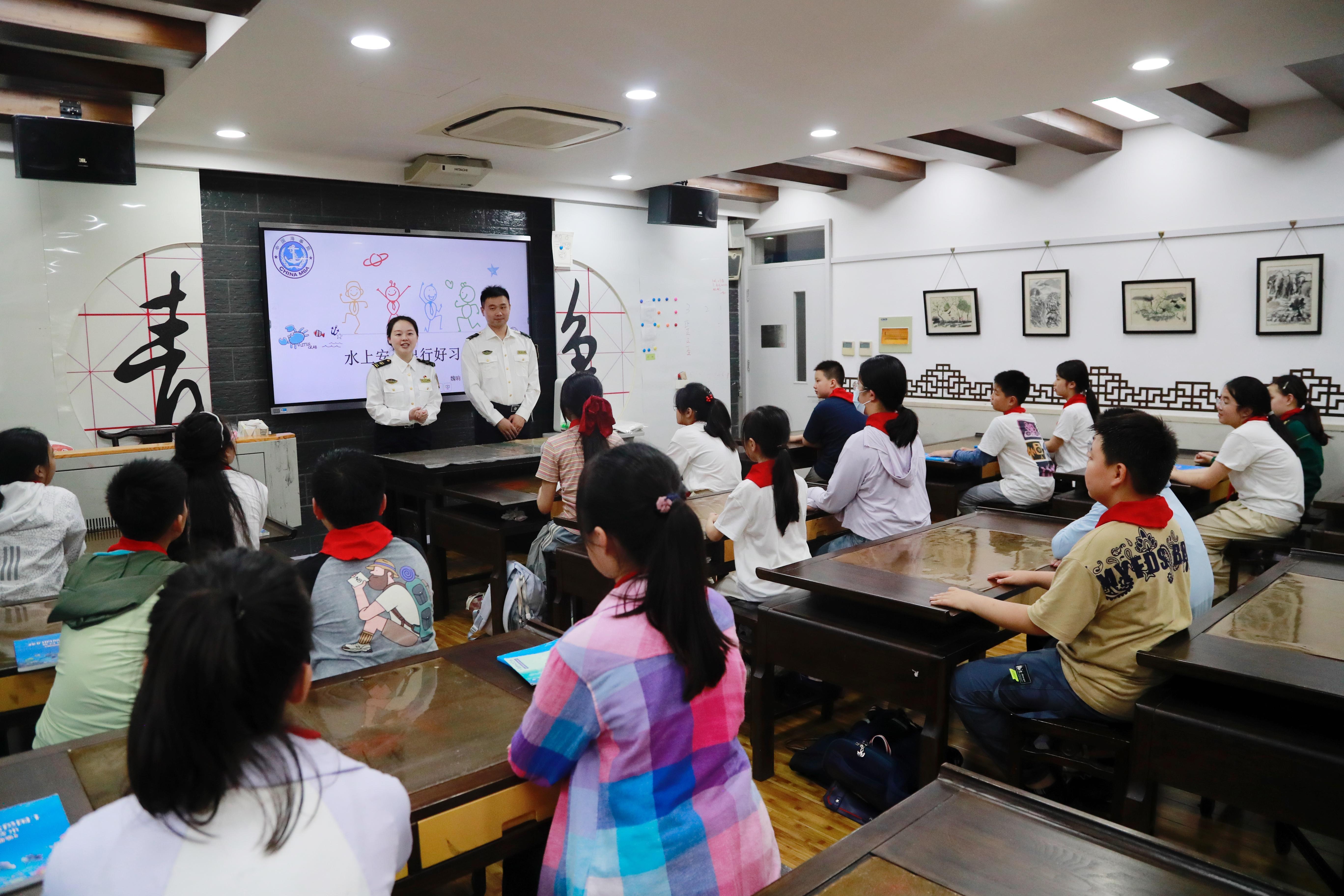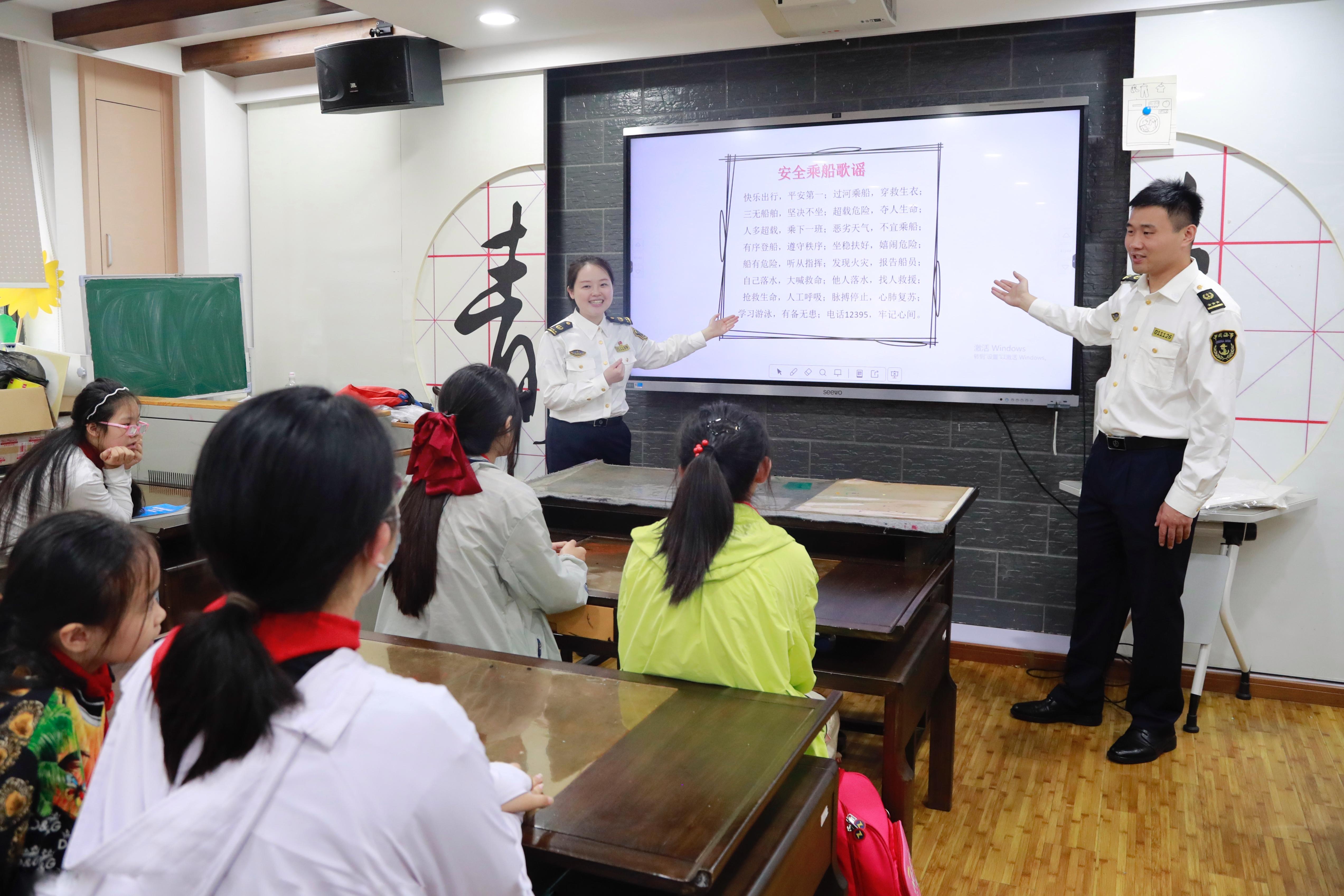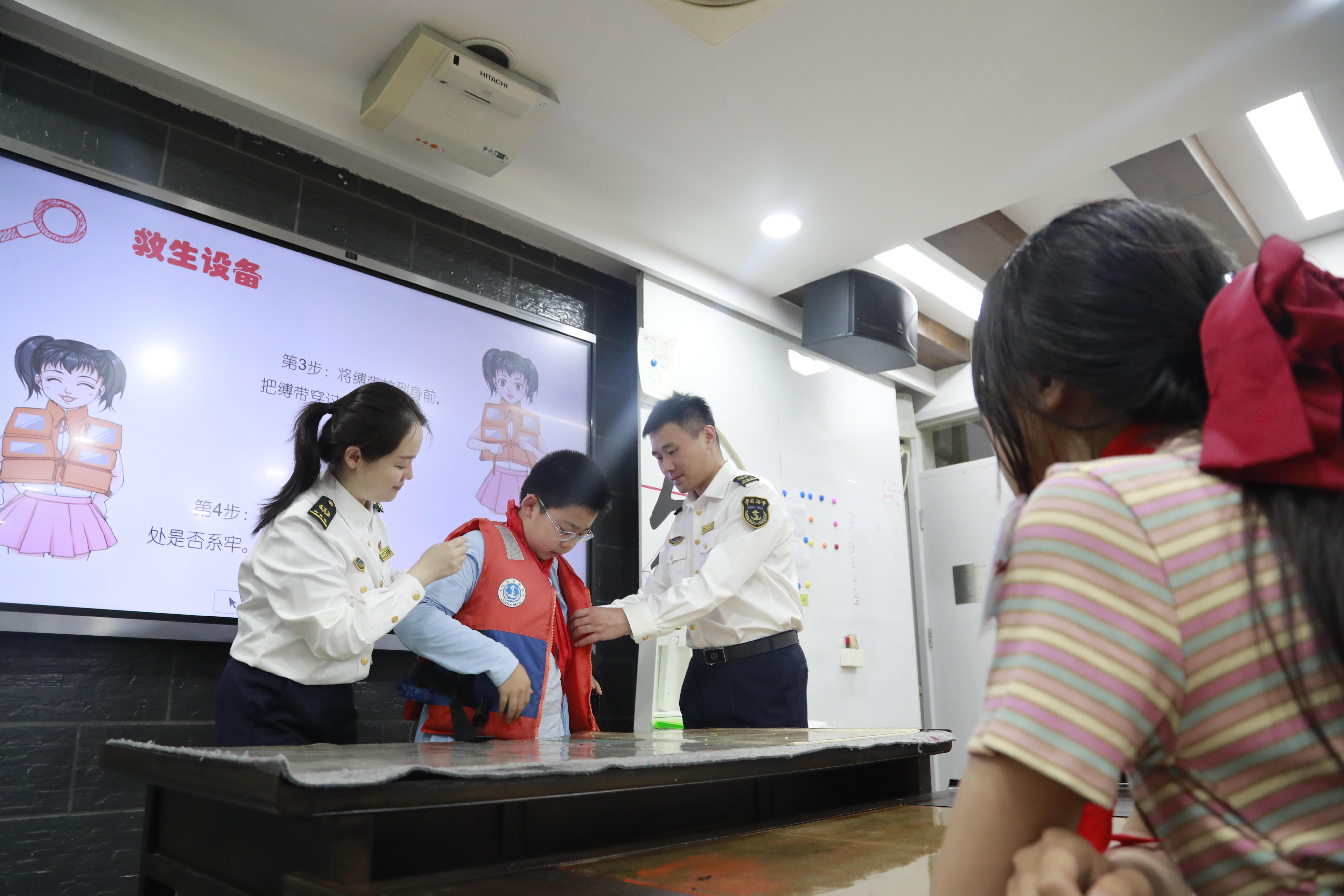 为更好地营造课堂氛围,教员还通过增加互动问答、“体验式”穿戴、“你画我猜”等环节充分调动孩子们课上参与的积极性,在寓教于乐中传授了水上交通常识、消防救生常识等水上出行的安全知识,孩子们在沉浸式的体验中更加生动立体地理解学习了水上安全出行知识。最后,课程在孩子们齐声诵读《安全乘船歌谣》声中画上圆满句号。