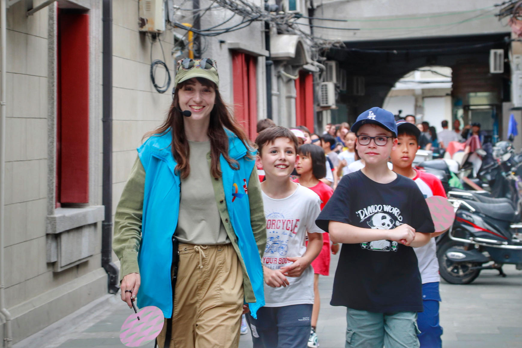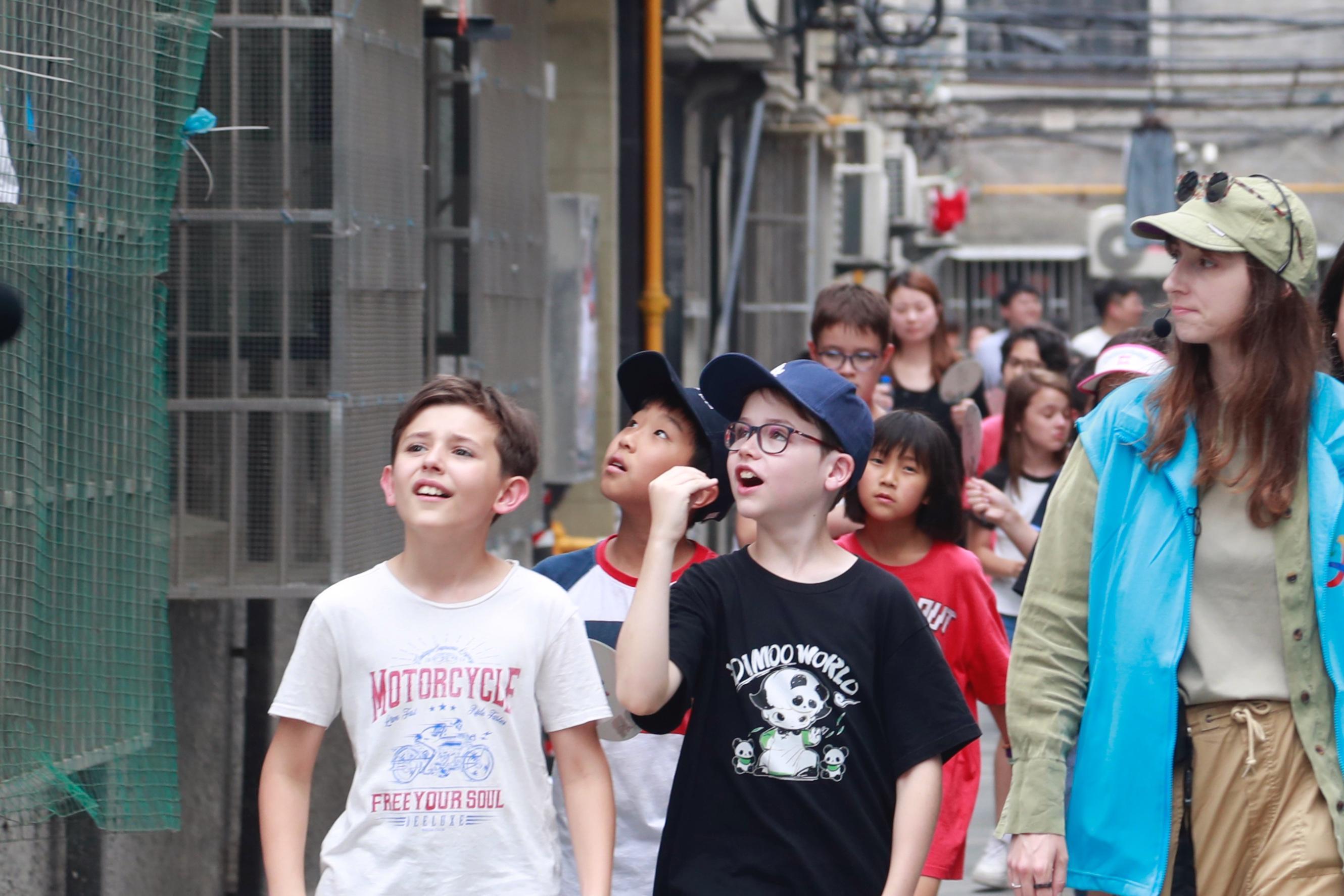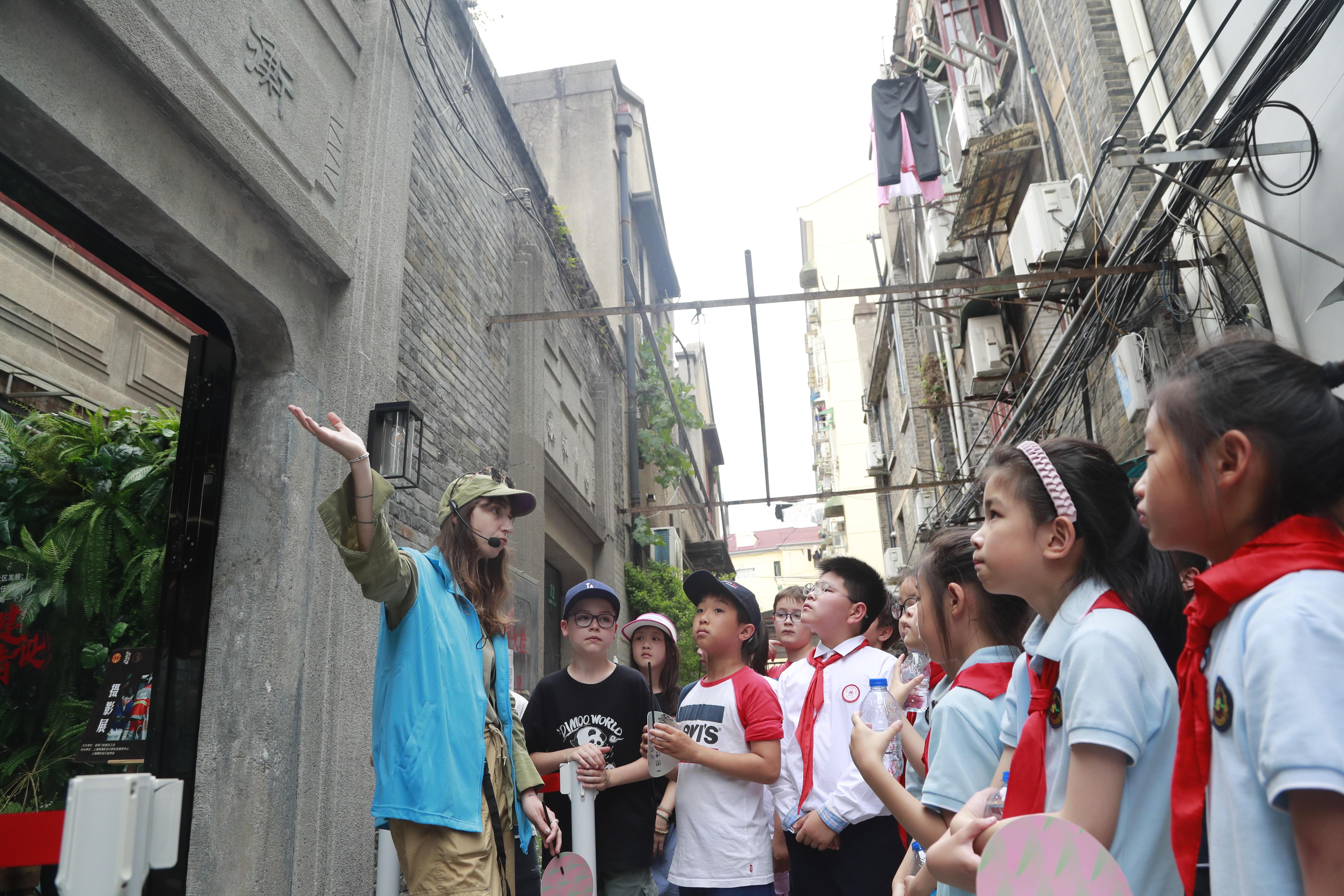 体验完弄堂九子游戏后,已然熟悉起来的中法萌娃们手牵着手,在上海国际旅游形象公益推广人、法国姑娘乐盖曦老师的带领下,以阅读行走的形式,漫步百年老西门。颇具烟火气的小马路、独特的弄堂建筑、乐乐老师风趣的讲解,中法小朋友们实地感受这片土地的历史痕迹,品味老上海独特的城厢文化和生活气息。