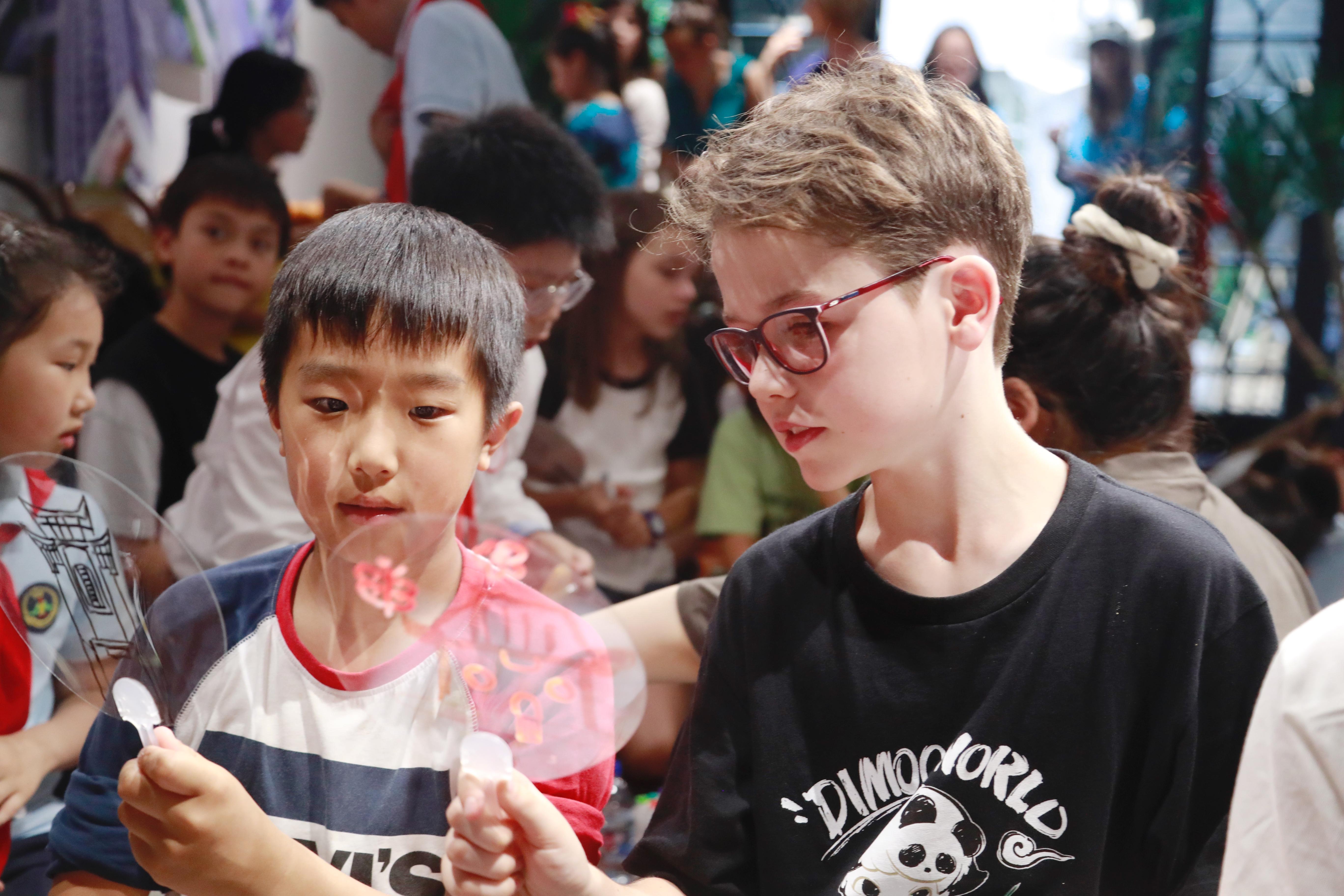 活动现场,中法小朋友共同体验了掼结子、跳房子、刮片子、打弹子等九子运动。法国小朋友陆一拿起手中的沙袋,经过志愿者的讲解,并仔细观摩后,有模有样地开始掼结子,只见他将沙袋高高抛起,并迅速将麻将牌翻面,最后稳稳接住沙袋,引来周围小朋友们的阵阵掌声。