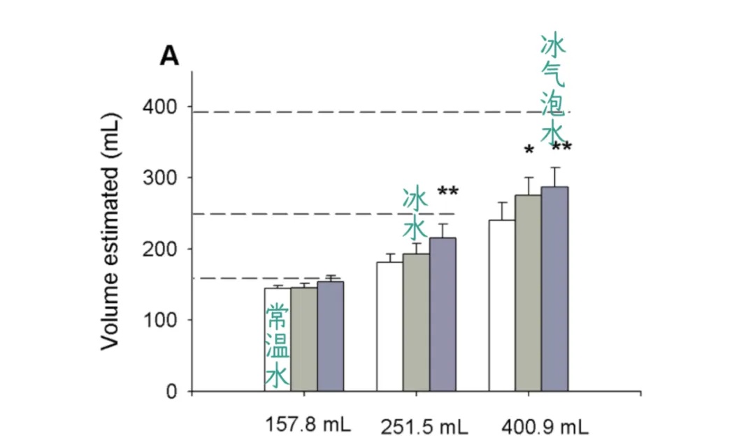 结果显示,先喝冰气泡水的人后续喝的常温水最少,其次是冰水,最后是常温水。这表明冰气泡水对缓解口渴的效果最好,其次是冰水,常温水最差。
