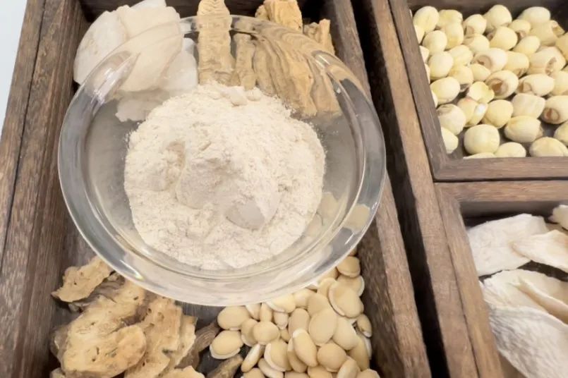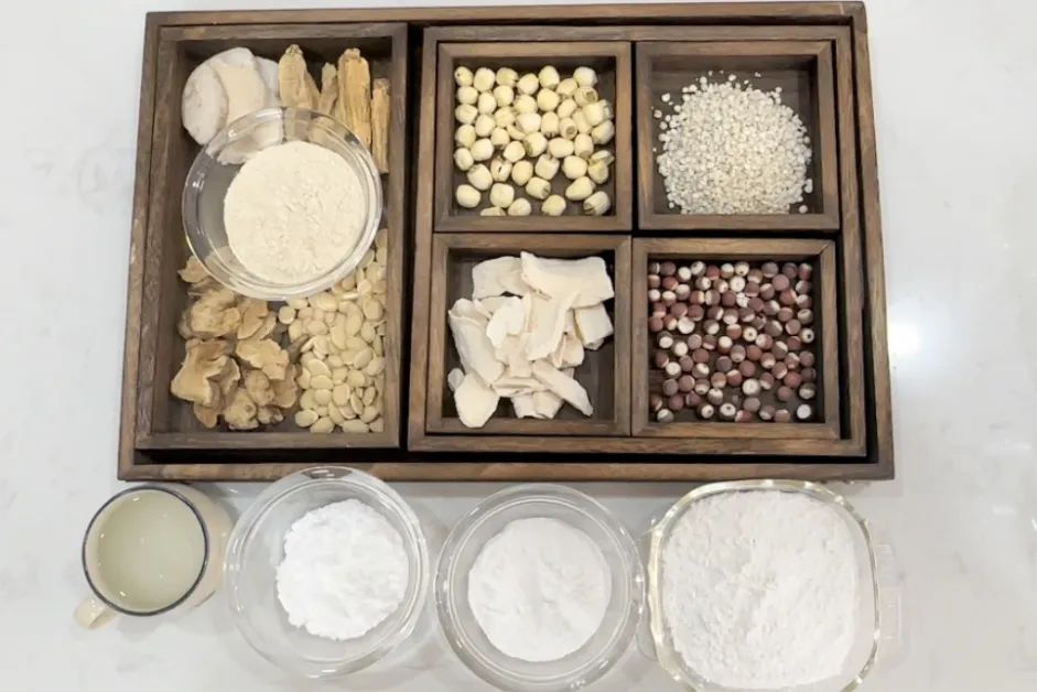 八珍粉:党参、白术、淮山药、莲子、白扁豆、薏仁、茯苓、芡实各25克打粉过筛。