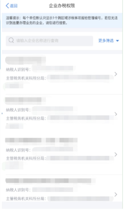页面会显示当前任职受雇单位列表,也可录入企业名称、纳税人识别号、主管税务机关科所分局和跨区域涉税事项报验管理编号进行查询。