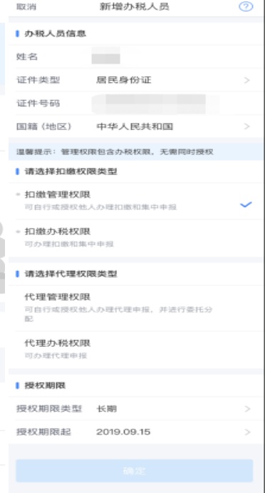 新增授权人员信息。针对扣缴管理权限、扣缴办税权限和代理管理权限系统限制人数为20人,对于代理办税权限系统限制人数为100人。