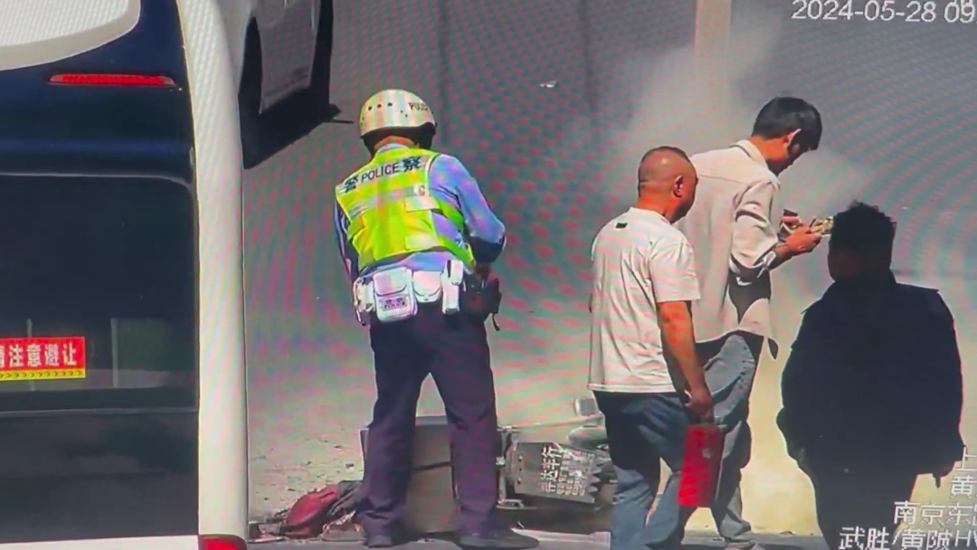 就在此时,增援警力也已赶到现场。徐建伟发现被干粉包裹着的电动自行车电池内部还有浓烟冒出,于是拦停路过的路政洒水车,对电池持续降温,整个处置过程仅用时5分钟。周围群众目睹此情此景,纷纷给他点赞。