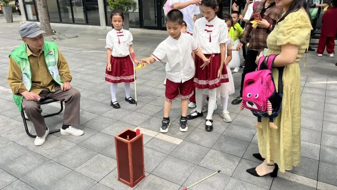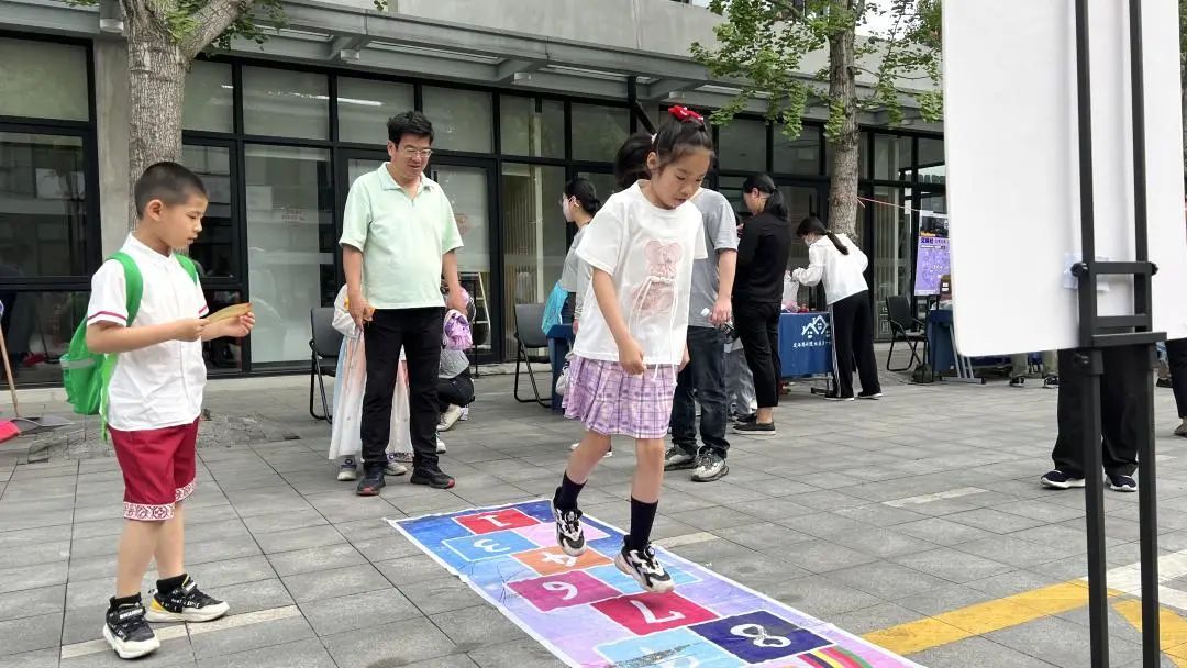 每一个弄堂游戏前面都排起了长队,孩子们争相体验,大人们则想回忆起儿时的美好瞬间。投壶、套圈、扔沙包,力气控制是关键,考验着参与者的精准度。跳房子的弄堂游戏是孩子们的最爱,黄欣漪小朋友表示,她玩的跳房子游戏是按照数字来跳的,感觉非常有意思。