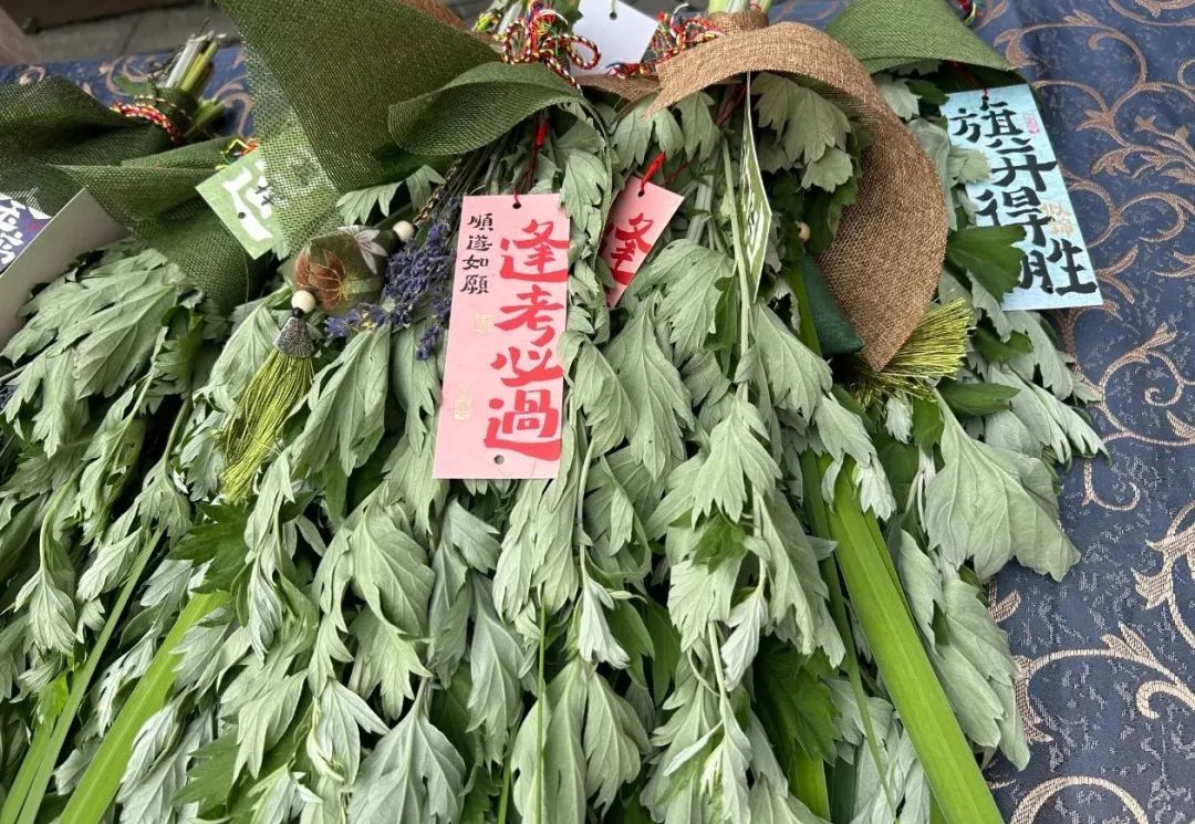 艾蒲芬芳,粽叶飘香。菖蒲形似利剑,驱魔祛病,庇佑家人;艾草驱蚊辟邪、祈福健康。学生们还用这些中草药做成端午主题花束,带着美好的寓意和绵绵情意,奔赴考场。
