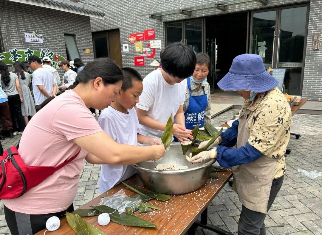 迎端午必不可少的当然是粽子。长桌上铺满了翠绿的粽叶、饱满的糯米和各种馅料,空气中弥漫着淡淡的粽叶清香。学生们围在桌前,一招一式学包粽子。